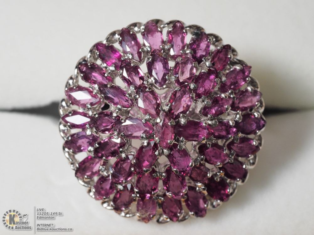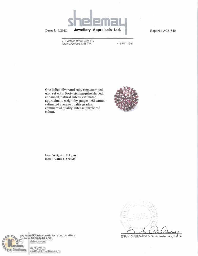 12-JP122 - STERLING SILVER ENHANCED RUBY (3.68CT) MARQUISE SHAPED RING W/COA. SUGGESTED RETAIL VALUE $700. JEWELLERY