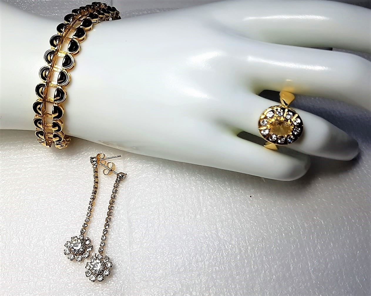 JEWELRY INCLUDING CLEAR CRYSTAL DROP STUD EARRINGS, GOLD TONE AND BLACK ENAMEL BRACELET WITH SAFETY CHAIN, HALO STYLE RING WITH MORGANITE CENTRE STONE, SIZE 8. JEWELRY