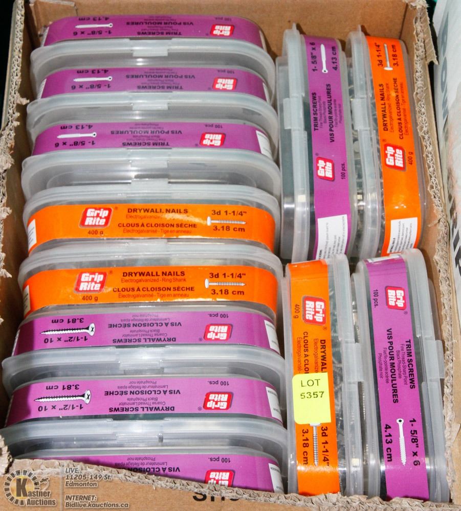 12 TUBS OF ASSORTED DRYWALL NAILS AND SCREWS
