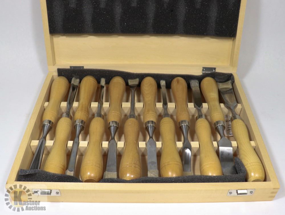 12PC WOOD CARVING CHISEL SET IN WOOD BOX.