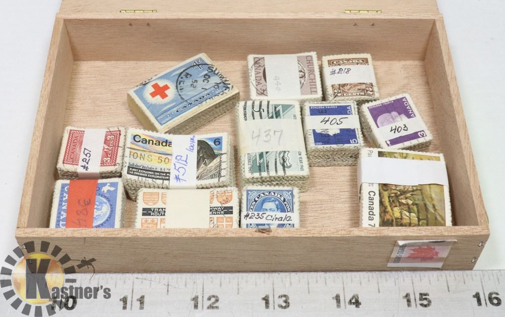 12X100 LOT CATALOGUED CANADIAN STAMPS IN CIGAR BOX