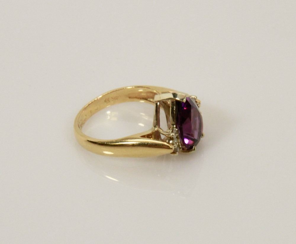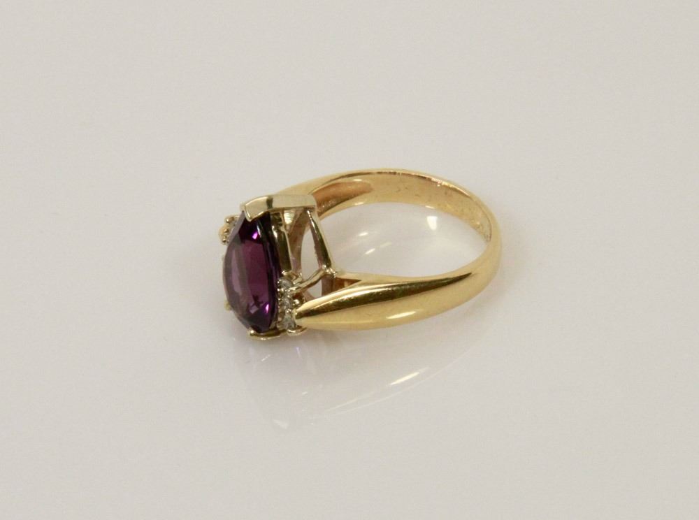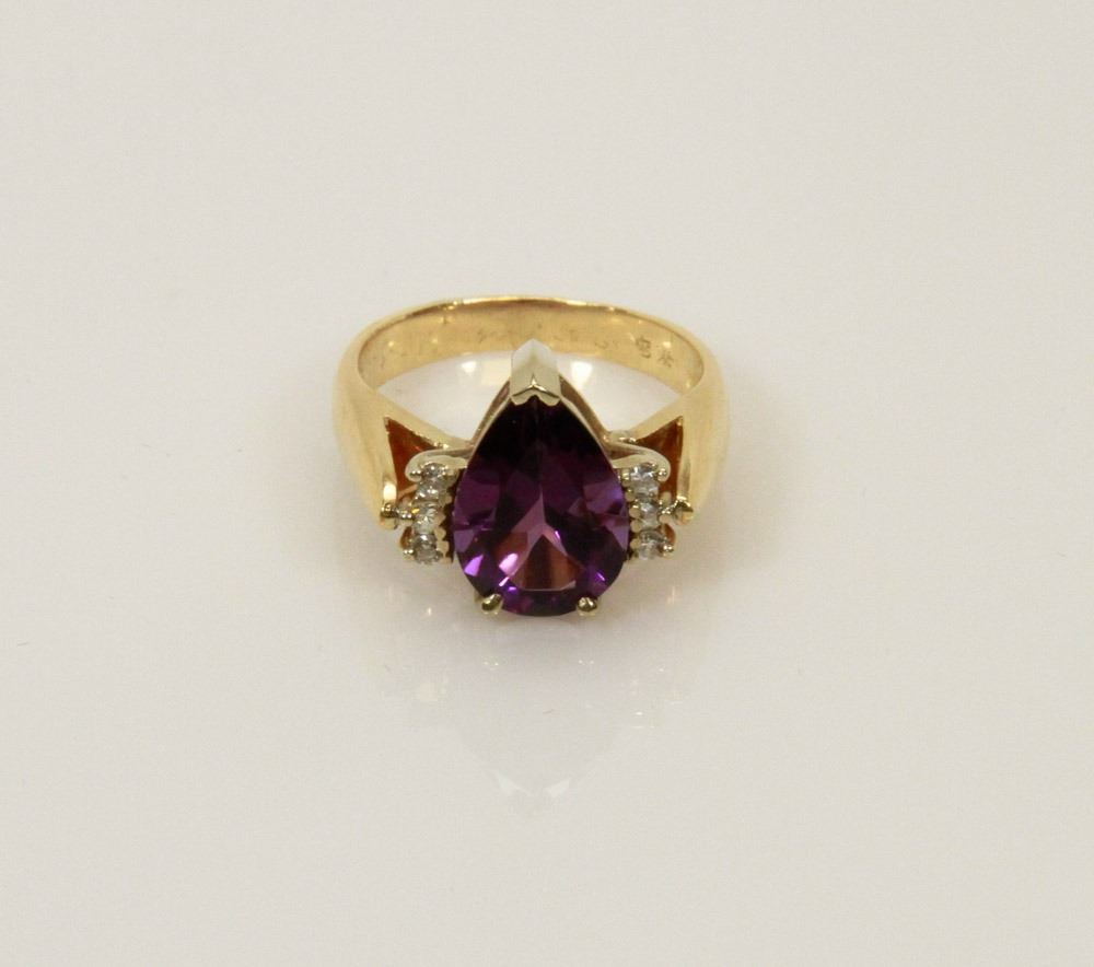 - RING HAS A PEAR SHAPED MIXED CUT AMETHYST (2.90CT) AND 6 ROUND SINGLE CUT - ROUND FULL CUT DIAMONDS (.12 TOTAL CT), RING SIZE 6.25. APPRAISAL FROM LOCAL APPRAISER, APPROXIMATE REPLACEMENT VALUE $1600.00+GST. JEWELLERY