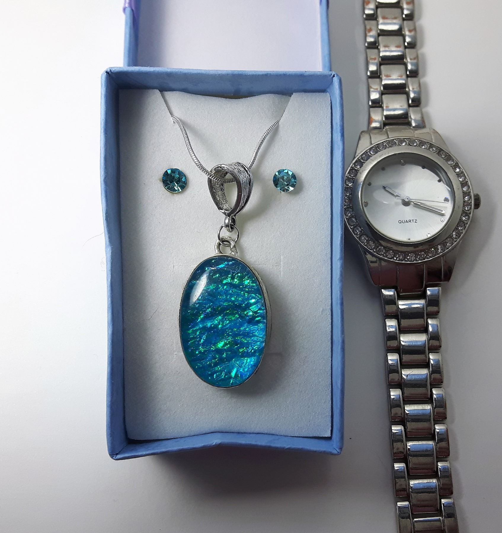 ON 20" SNAKE CHAIN, BLUE CRYSTAL STUD EARRINGS , ROUND CRYSTAL EMBELLISHED WATCH, NEW BATTERY. JEWELRY