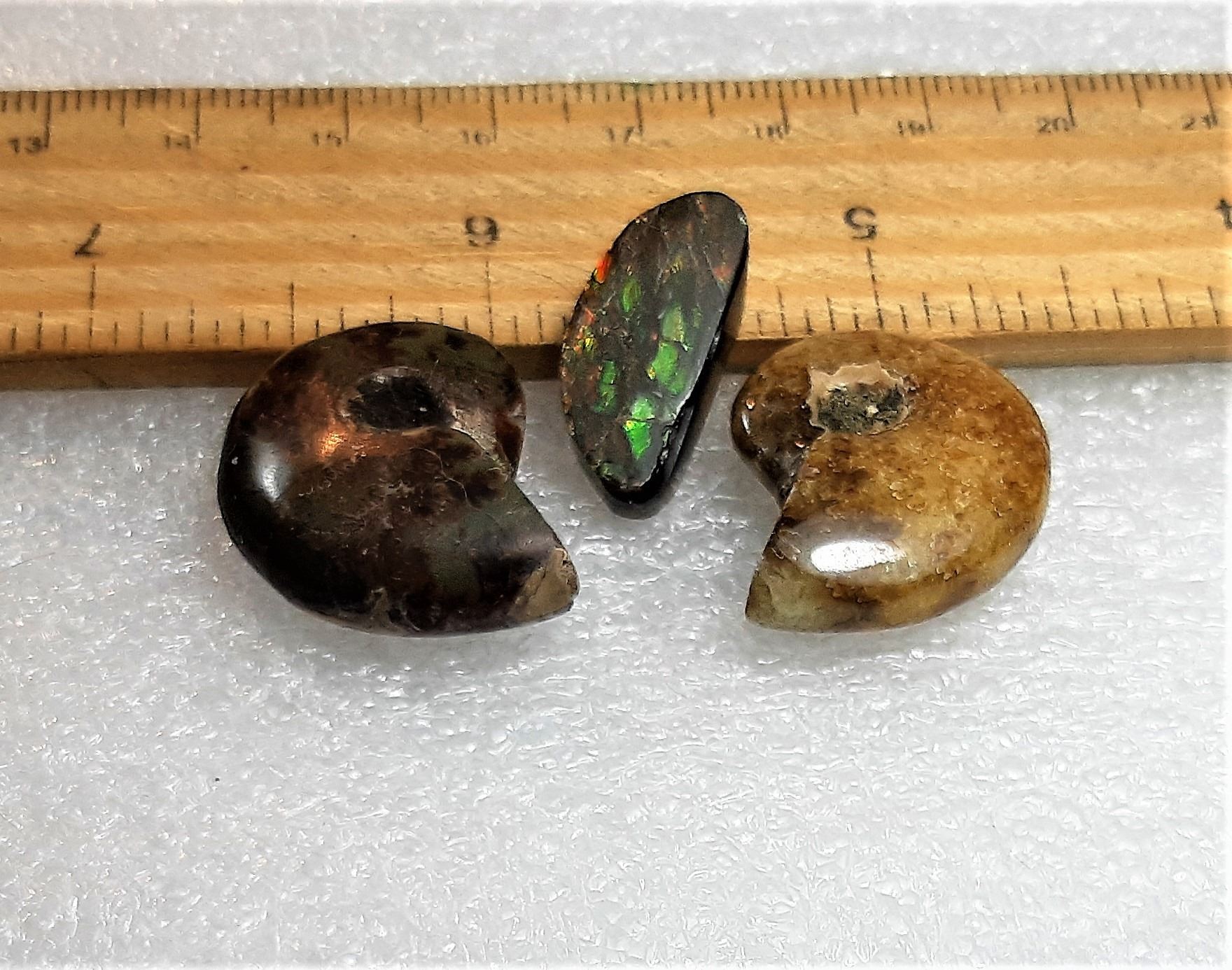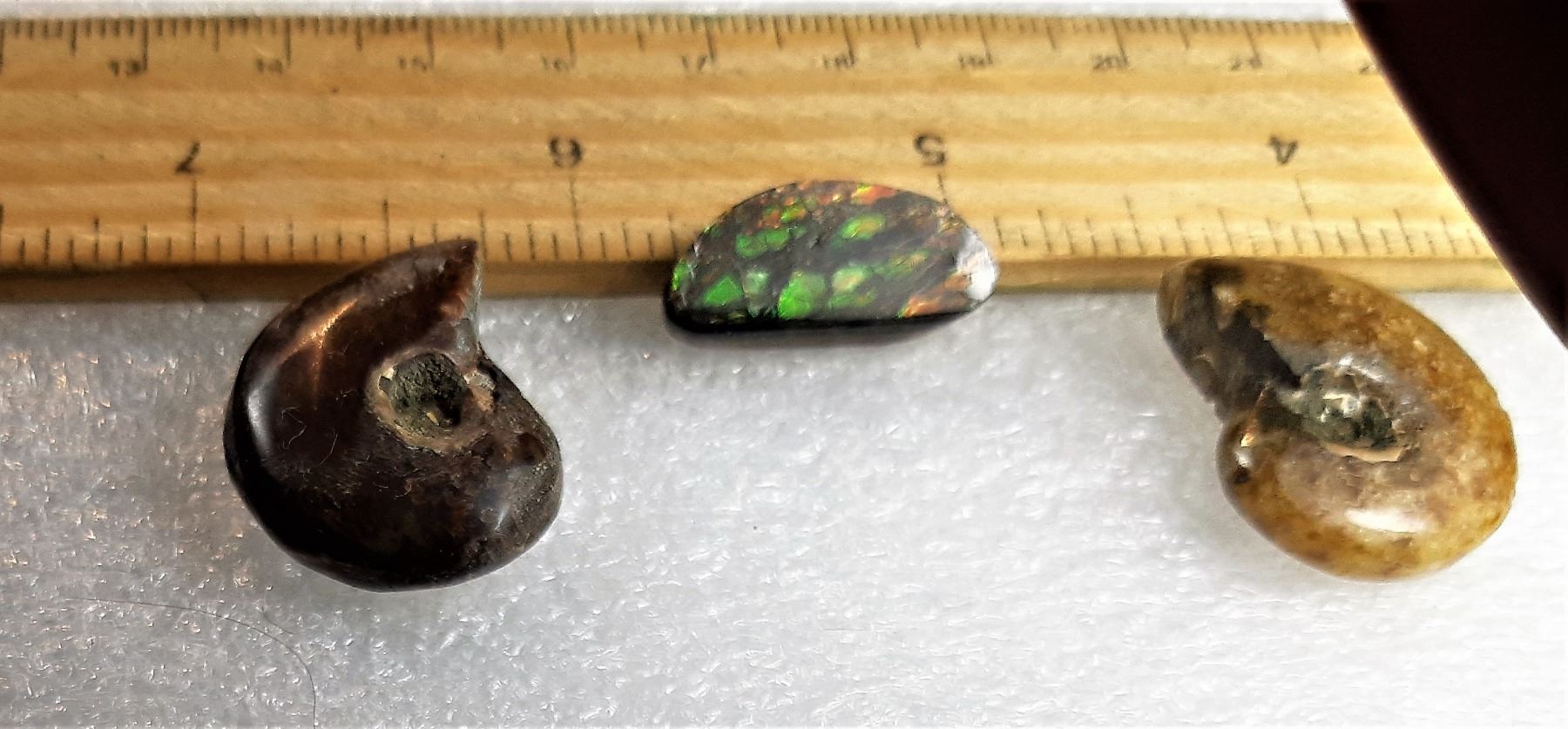 FOSSIL SPECIMENS AND A GREEN FIRE AMMOLITE GEMSTONE, 71 CT, READY FOR SETTING. JEWELRY