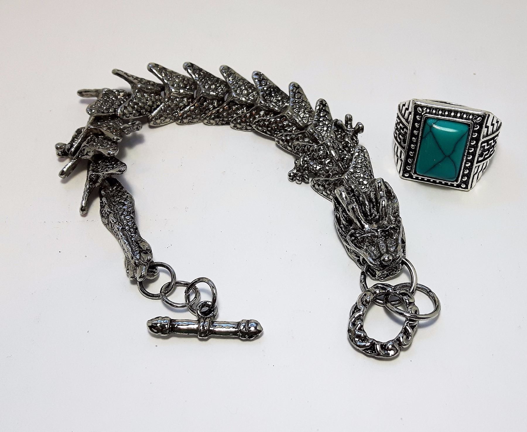 BRACELET HAS A TOGGLE CLOSURE AND RING IS SQUARE CUT WITH TURQUOISE STONE, SIZE 10.75