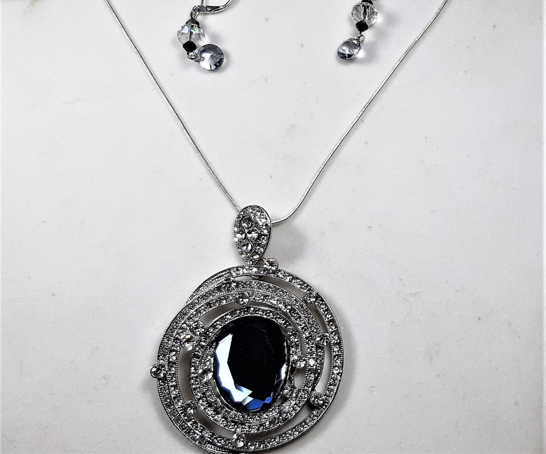 AND GREY PENDANT ON 24" SNAKE CHAIN WITH COORDINATING SWAROVSKI CRYSTAL DROP EARRINGS ON 925 STAMPED FRENCH WIRES, PENDANT HAS A 2" DIAMETER. JEWELRY