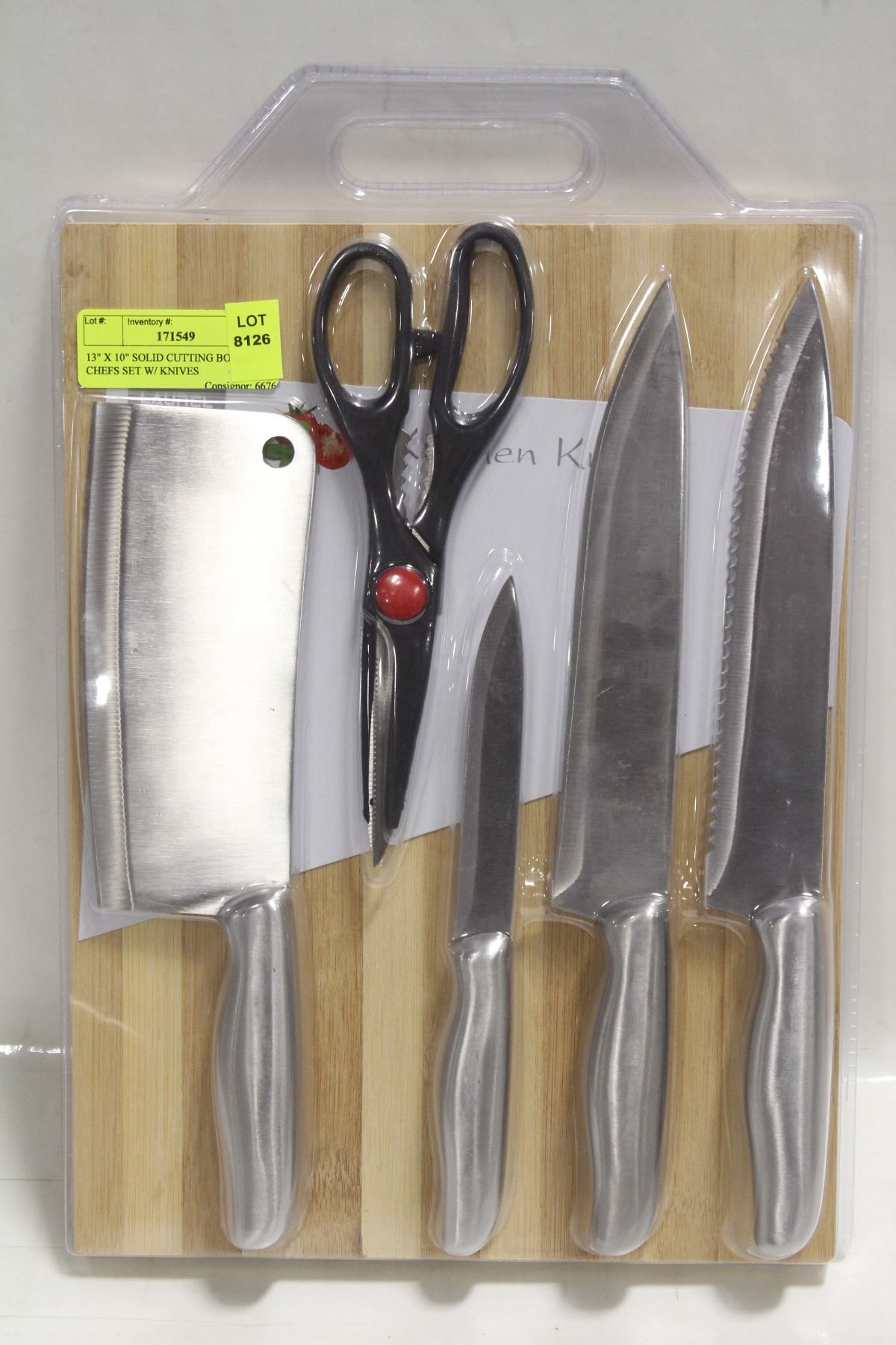 STAINLESS STEEL CLEAVER, PARING KNIFE, CHEF'S KNIFE & SERRATED KNIFE & SNIPS. BOARD: 13.5" X 10" X 5/8"
