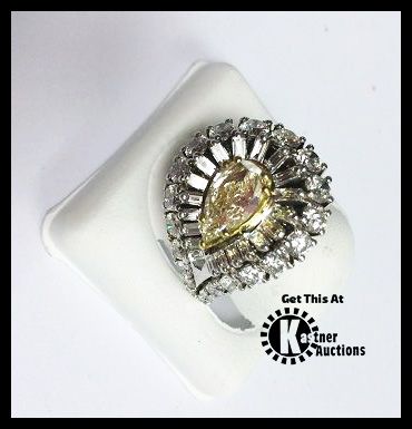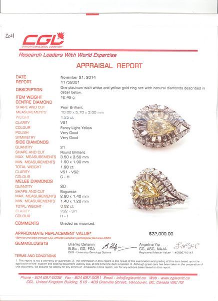 1=1.25 cts. PEAR SHAPED DIAMOND, VS1 CLARITY, FANCY LIGHT YELLOW COLOR, SIDE DIAMONDS 21=1.98 cts. T.W. ROUND BRILLIANT CUT, VS1-VS2 CLARITY, G/H COLOR, 20=.82 cts. T.W. BAGUETTE CUT DIAMONDS, VS2-SI1 CLARITY, H/I COLOR, AGS CERTIFICATE, RETAIL VALUE $22,000.00