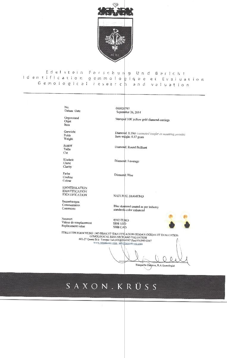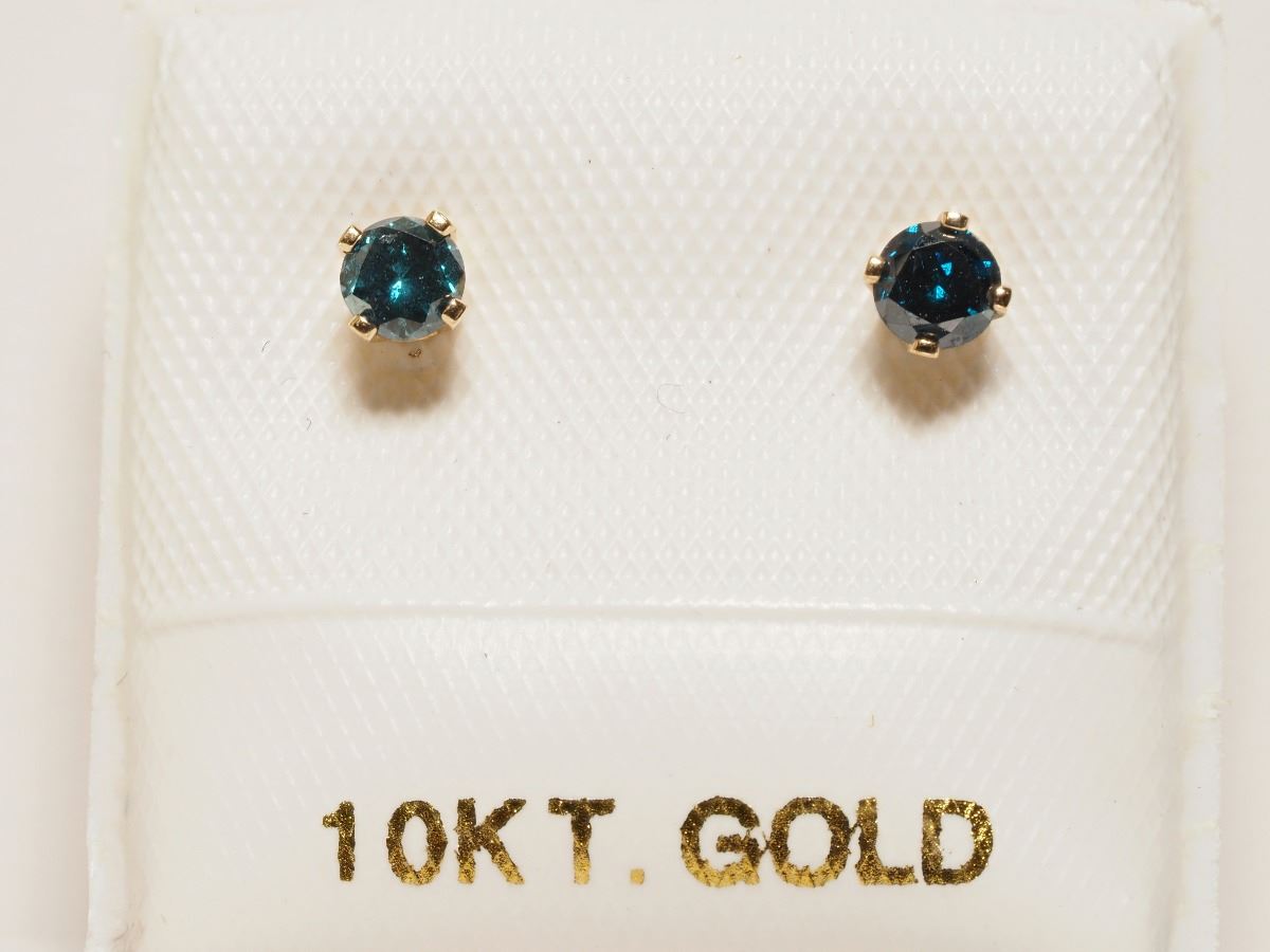 10K YELLOW GOLD BLUE DIAMOND(0.19CT) EARRINGS. W/ COA- SUGGESTED REPLACEMENT VALUE $988