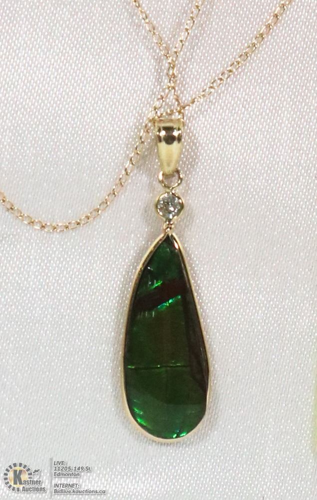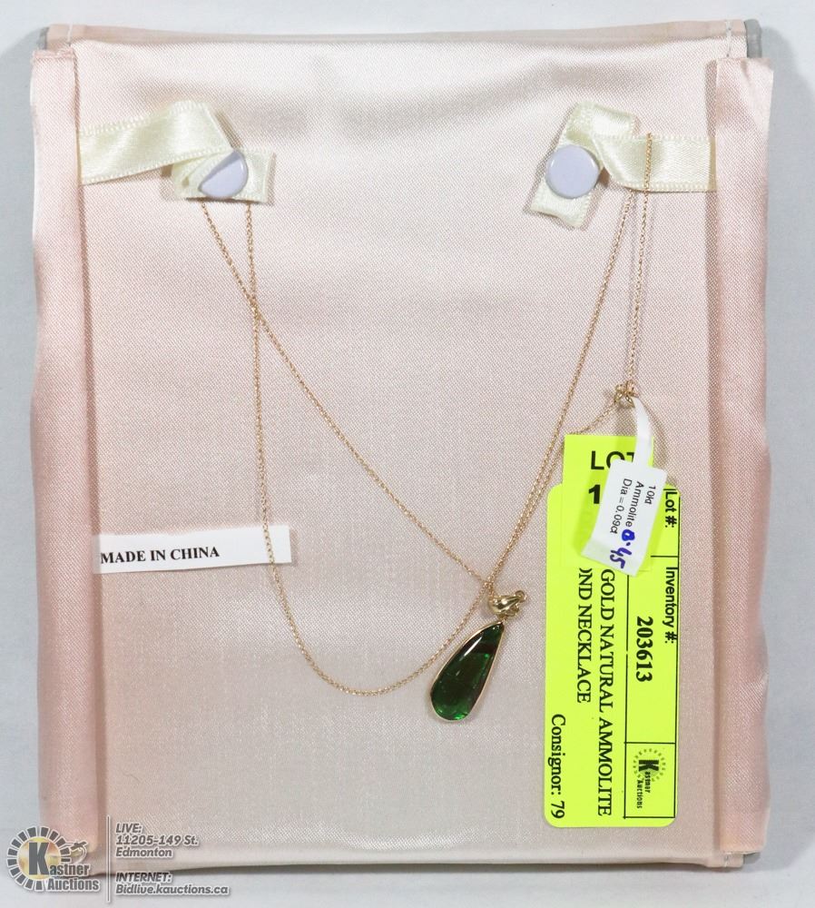 14-LS38- 10KT GOLD NATURAL AMMOLITE AND DIAMOND (0.09CT) NECKLACE HAND CRAFTED IN CANADA W/COA. SUGGESTED REPLACEMENT $1800. JEWELLERY