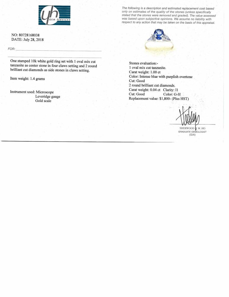 64-JP159 - 10KT GOLD TANZANITE (1CT) & DIAMOND (0.04CT) RING, MADE IN CANADA W/COA. SUGGESTED REPLACEMENT VALUE $1800.00. JEWELLERY