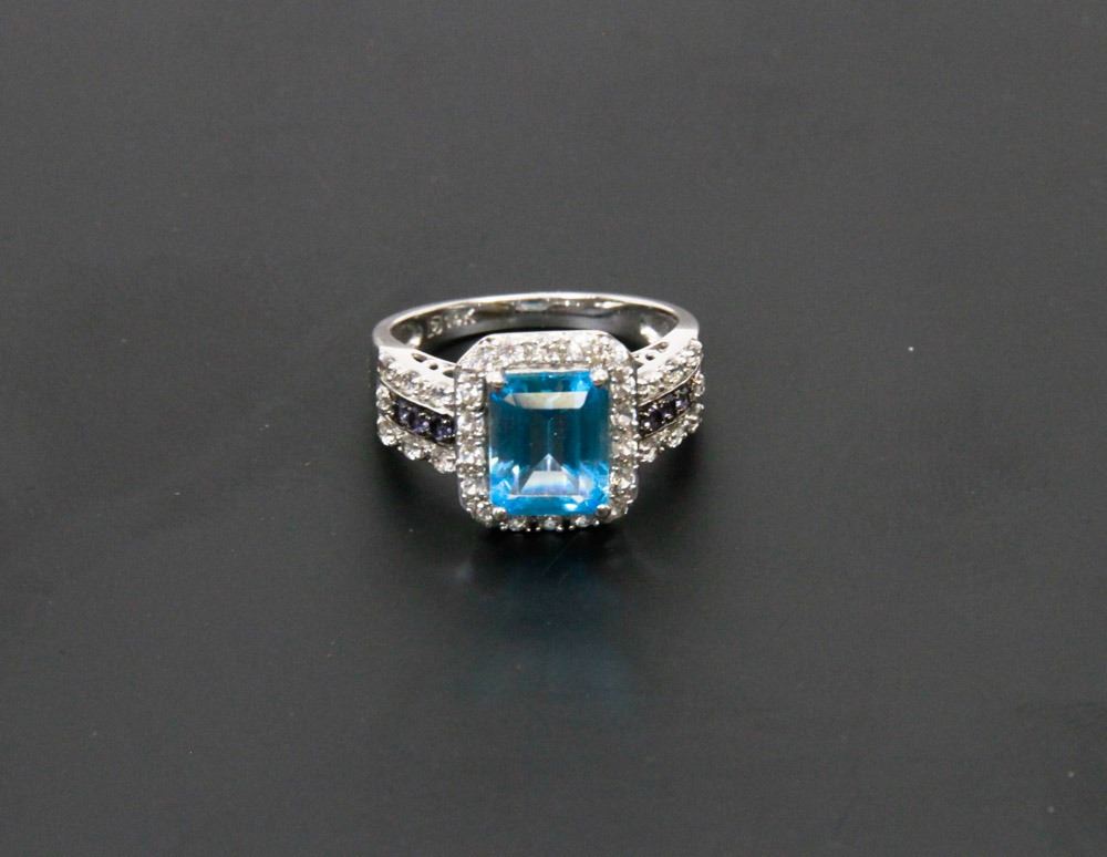 - RING IS SET WITH ONE EMERALD CUT BLUE TOPAZ GEMSTONE (2.75CT), TWO ROUND SINGLE CUT DIAMONDS (.01 TOTAL CT), THIRTY MIXED CUT WHITE TOPAZ GEMSTONES (.50CT) AND SIX ROUND MIX CUT TANZANITE GEMSTONES (.12CT), RING SIZE 7.5. APPRAISAL FROM LOCAL APPRAISER, APPROXIMATE REPLACEMENT VALUE $1000.00+GST. JEWELLERY