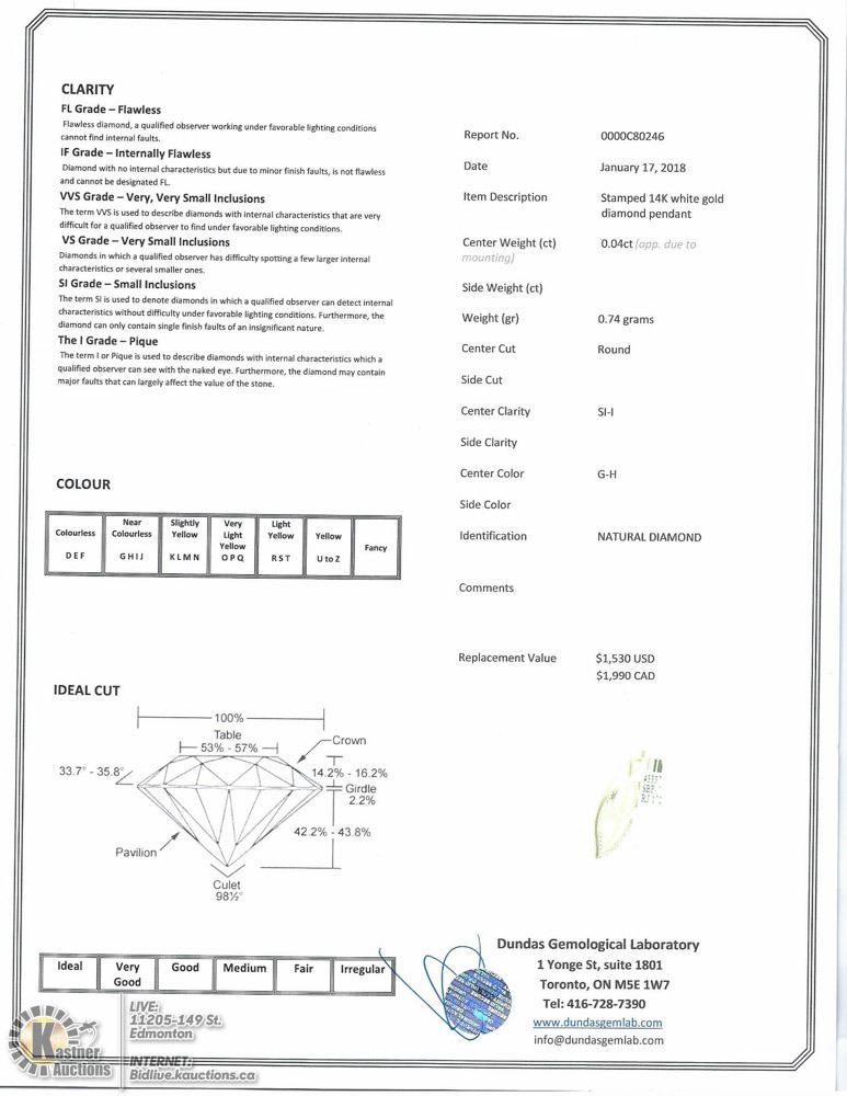 14-LS99 - 14KT WHITE GOLD DIAMOND (0.04CT) PENDANT W/COA. SUGGESTED REPLACEMENT VALUE $1990.00. JEWELLERY