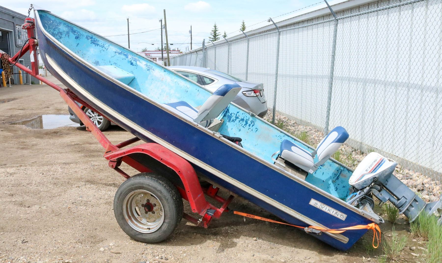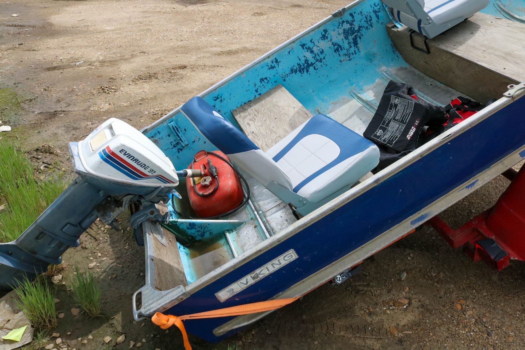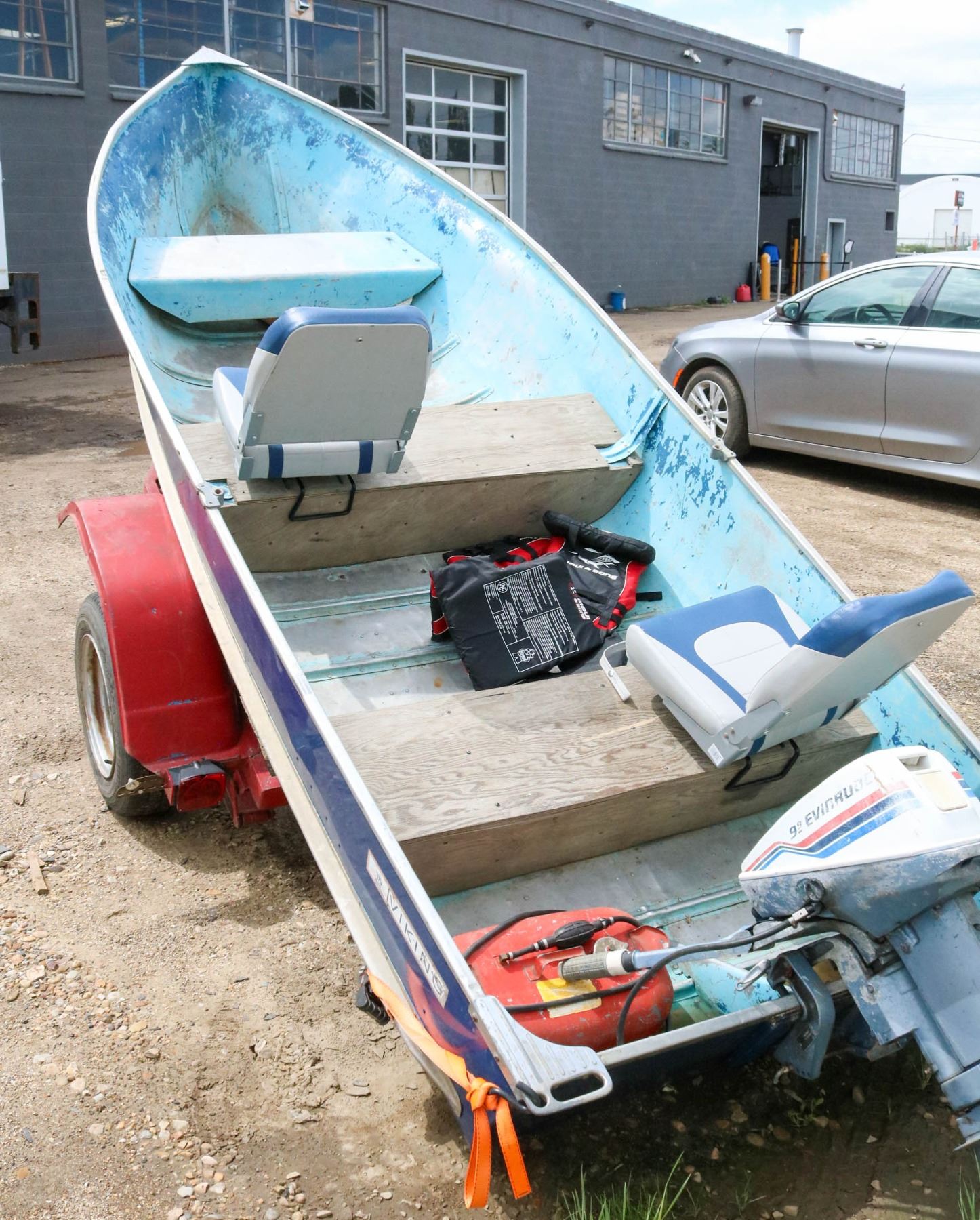 9.9 EVINRUDE 2 STROKE MOTOR, MODEL NO: SDE 2995, 2 LIFE JACKET AND MORE. TRAILER SERIAL #AB6013235 - AUTOMOTIVE