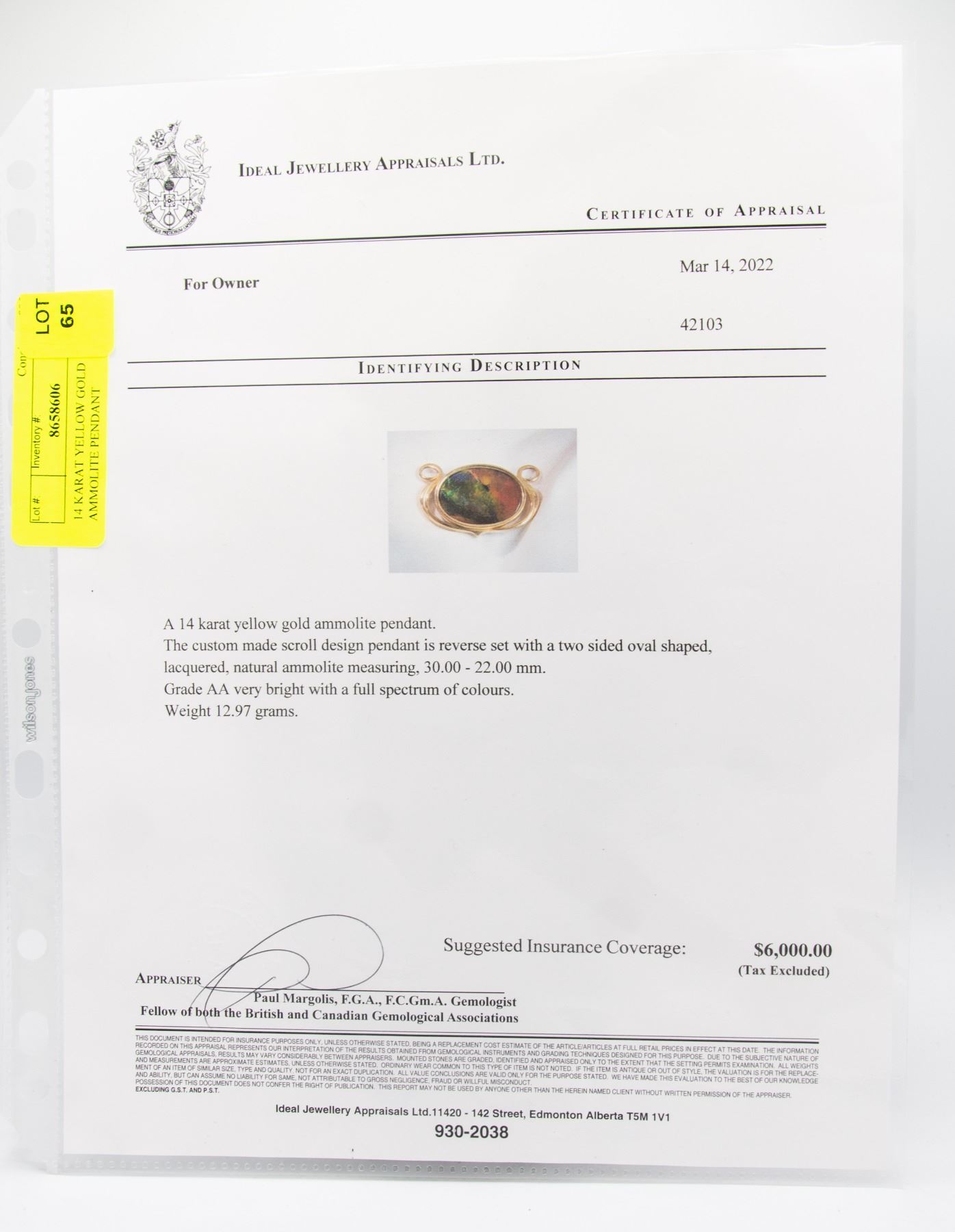 THE CUSTOM MADE SCROLL DESIGN PENDANT IS RESERVE SET WITH A TWO SIDED OVAL SHAPED, LACQUERED, NATURAL AMMOLITE MEASURING 30.00 - 22.00MM. GRADE AA VERY BRIGHT WITH A FULL SPECTRUM OF COLOURS. TOTAL WEIGHT 12.97 GRAMS. COMES WITH APPRAISAL WITH A CURRENT VALUE OF $6000 **ALL ITEMS MUST BE REMOVED BY 5PM MONDAY, NOVEMBER 14TH, 2022. ALL REMAINING ITEMS WILL BE SUBJECT TO A $6.00 PER DAY STORAGE CHARGE. ANY ITEMS REMAINING AFTER SUNDAY, DECEMBER 4, 2022 WILL BE CONSIDERED FORFEITED. NO REFUNDS WILL BE ISSUED FOR FORFEITED ITEMS. TO SCHEDULE A PICK UP APPOINTMENT CLICK HERE