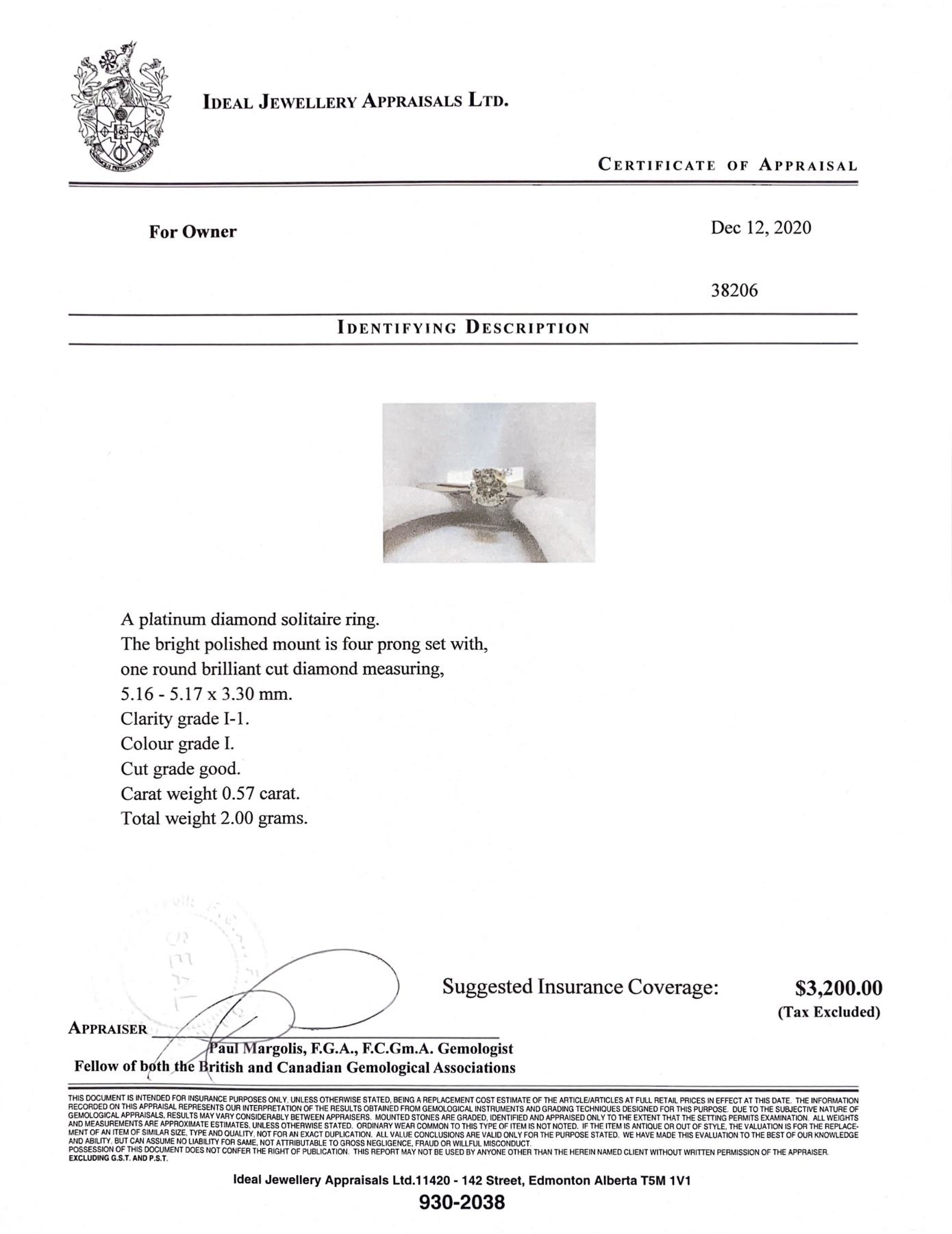 PLATINUM DIAMOND SOLITAIRE RING SIZE 6.5 THE BRIGHT POLISHED MOUNT IS FOUR PRONG SET WITH, ONE ROUND BRILLIANT CUT DIAMOND MEASURING, 5.16 - 5.17 X 3.30 MM. CLARITY GRADE I-1.COLOUR GRADE I. CUT GRADE GOOD. CARAT WEIGHT 0.57 CARAT. TOTAL WEIGHT 2.00 GRAMS. COMES WITH CERTIFICATE OF APPRAISAL FROM LOCAL APPRAISER, SUGGESTEDINSURANCE COVERAGE $3200.00. JEWELLERY