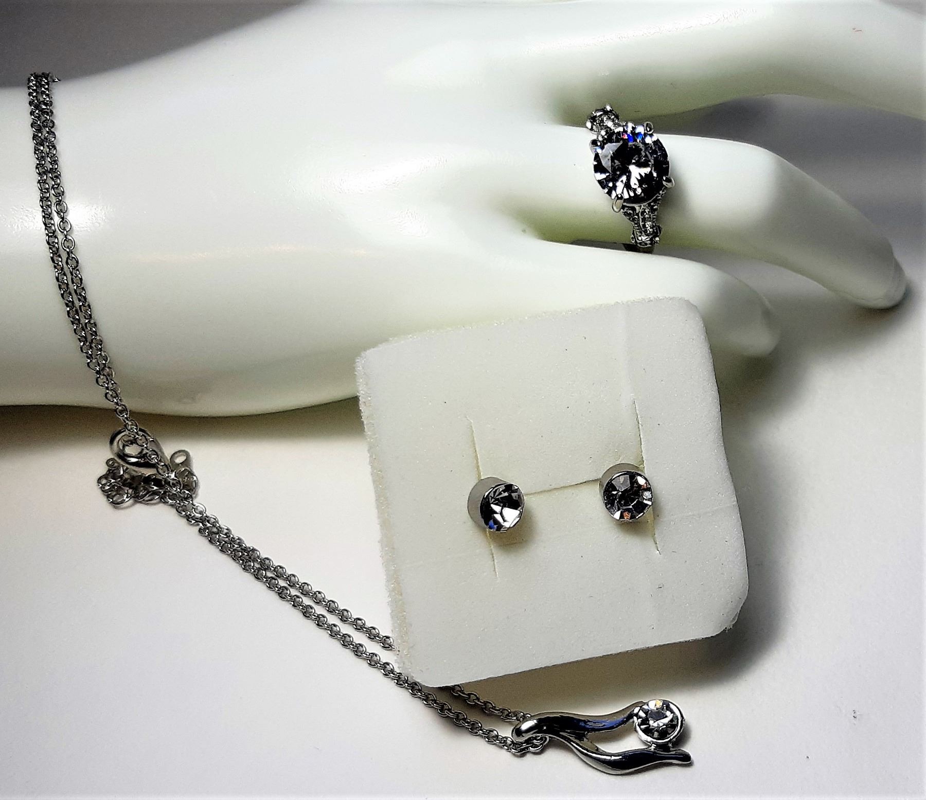 ROUND STUD EARRINGS, PENDANT ON CHAIN AND WHITE TOPAZ ROUND SOLITAIRE RING, SIZE 8. JEWELLERY