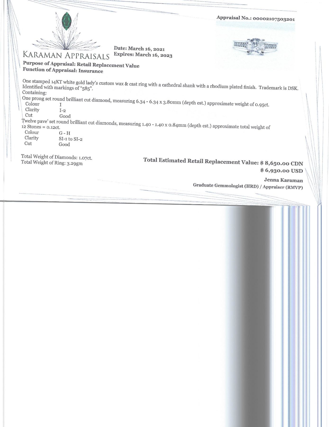14K WHITE GOLD DIAMOND (0.95CT,I2,I) +0.12CT RING (~SIZE 6.75) (~WEIGHT 3.29G), MADE IN CANADA