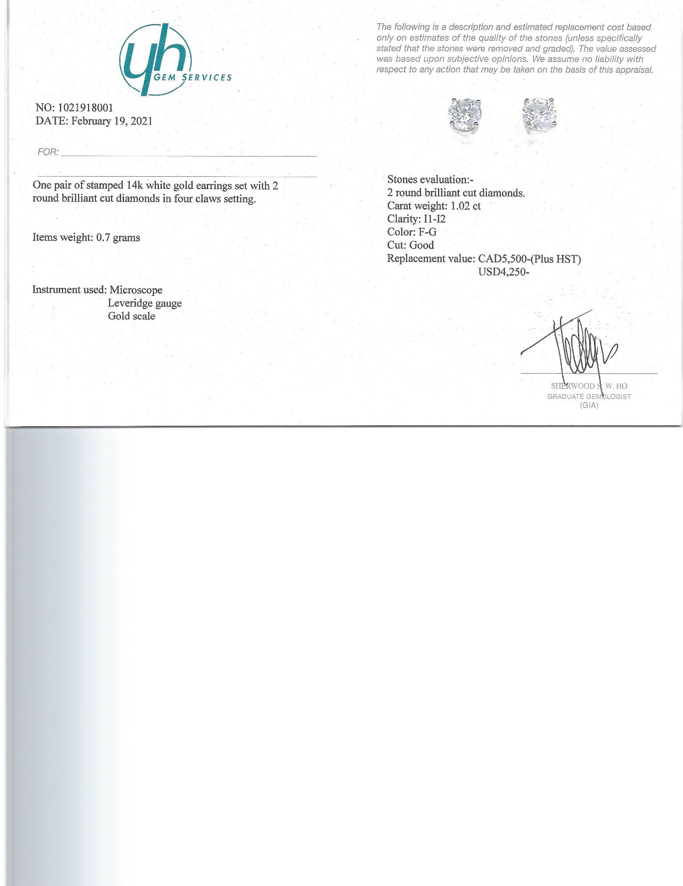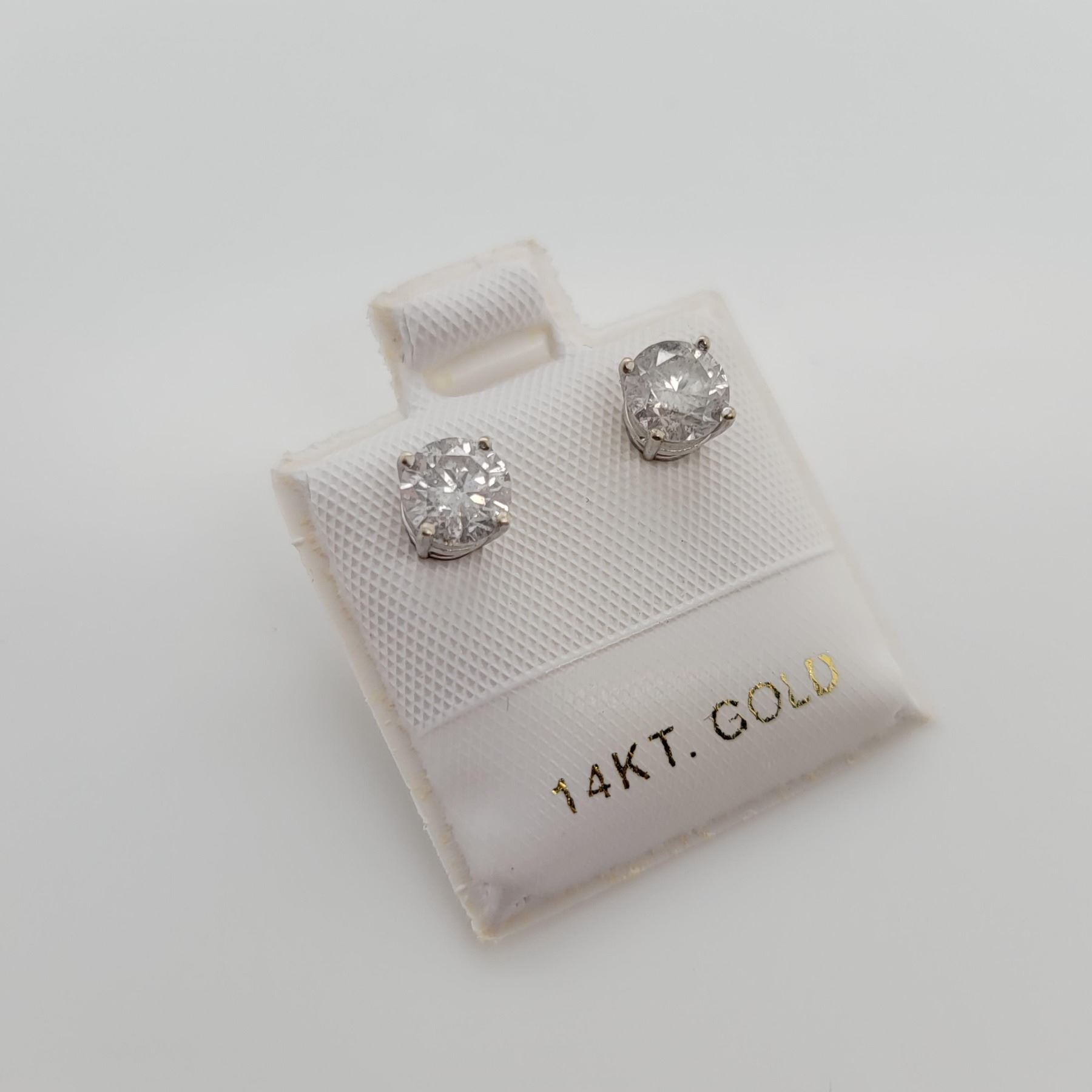 14K WHITE GOLD DIAMOND (1.02CT,I1-2,F-G) EARRINGS (~WEIGHT 0.7G), MADE IN CANADA