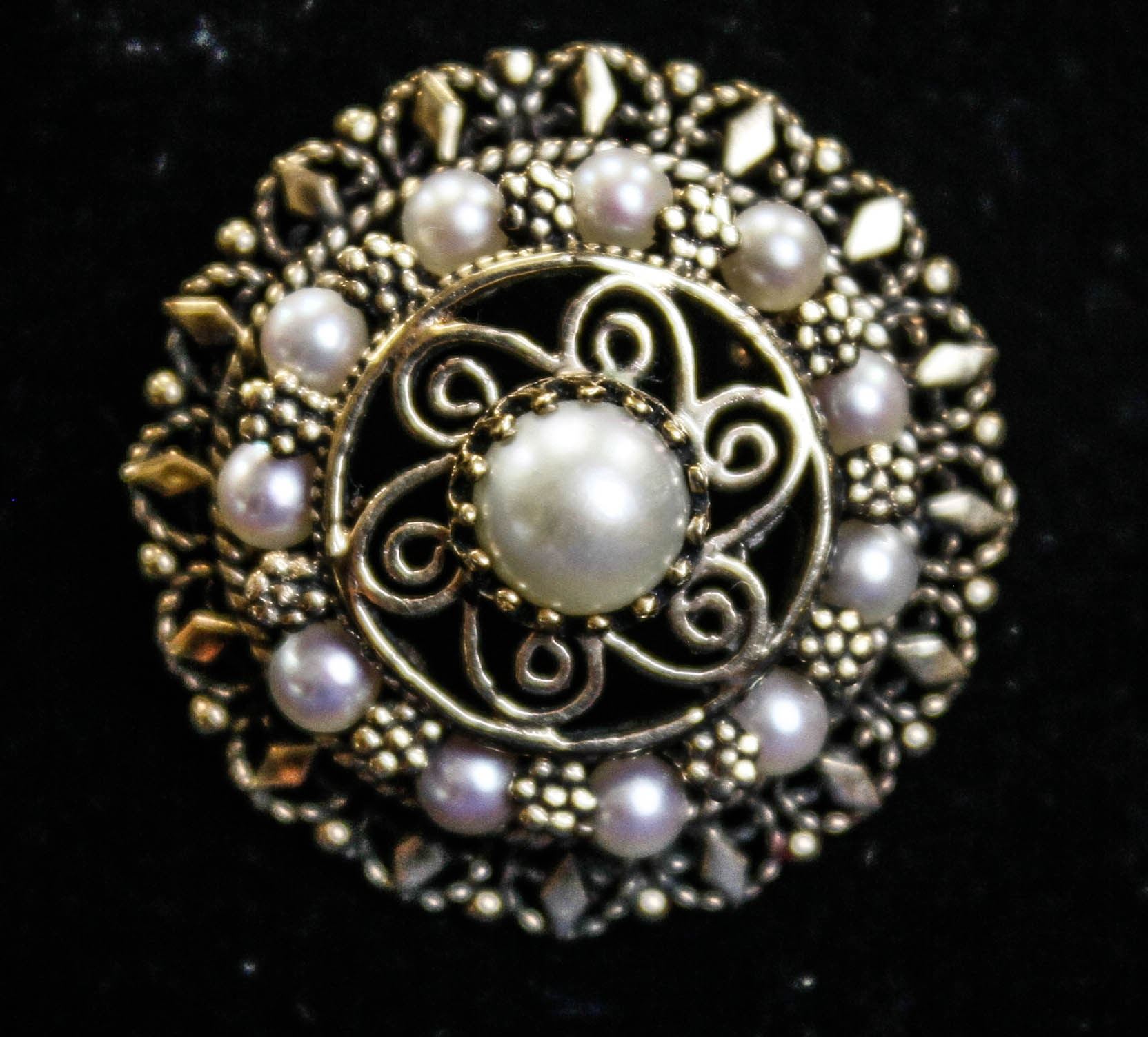 14K GOLD ANTIQUE STYLE PEARL BROOCH 10.5GRAMS