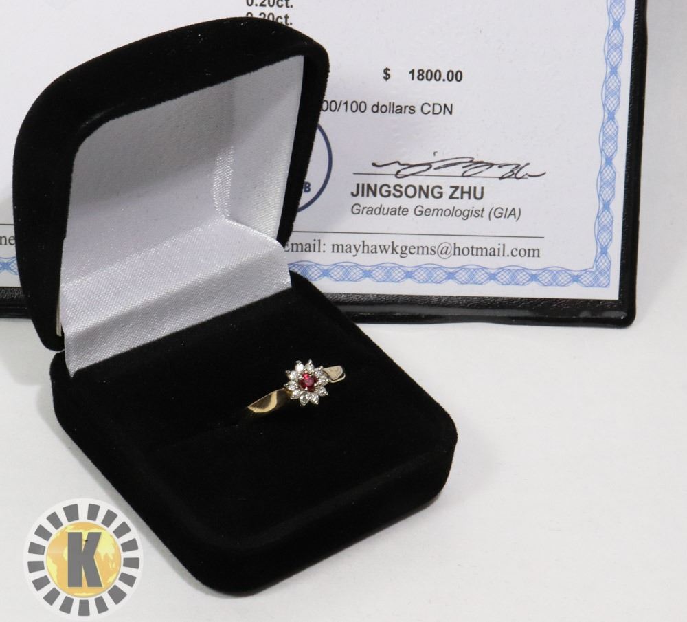 $1800.00 REPLACEMENT APPRAISAL BY MGI GEMLAB (TORONTO) 14K YELLOW/WHITE GOLD WITH .2 CARAT RUBY 10 DIAMONDS .2 TOTAL CARAT WEIGHT 2.8G TOTAL WEIGHT.***ITEM LOCATED IN LETHBRIDGE AB