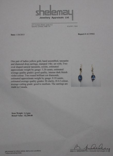 TANZANITE: 3.2 CARATS, DIAMOND: 0.10 SI CLARITY H-I-J COLOR, REPLACEMENT VALUE $2,200.00