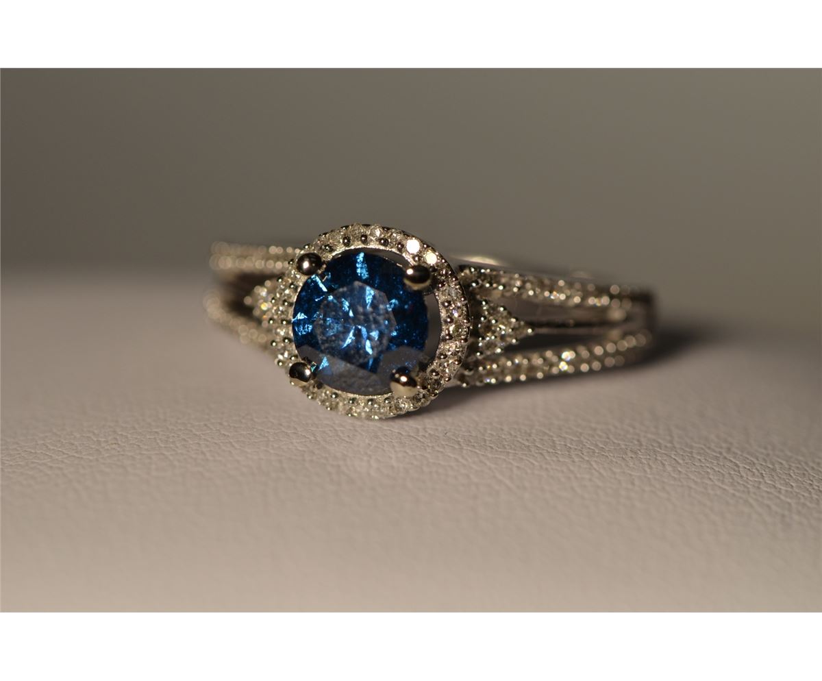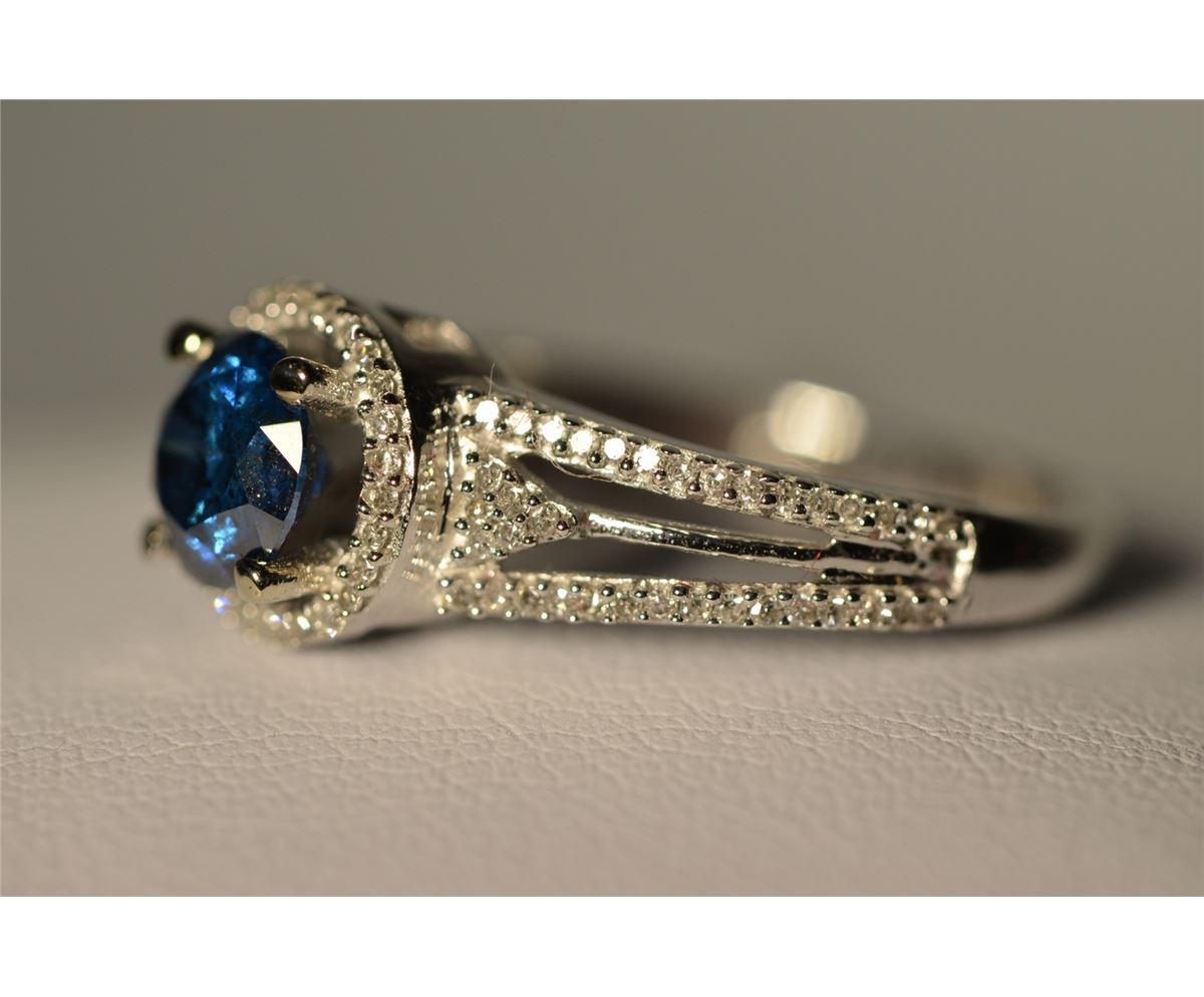 White Gold; Blue Diamond: 0.96 cts, Round Brilliant Cut; White Diamond: 100 Diamonds, 0.21 cts, Single Cut, VS-SI Clarity; Size 6.25; with certificate