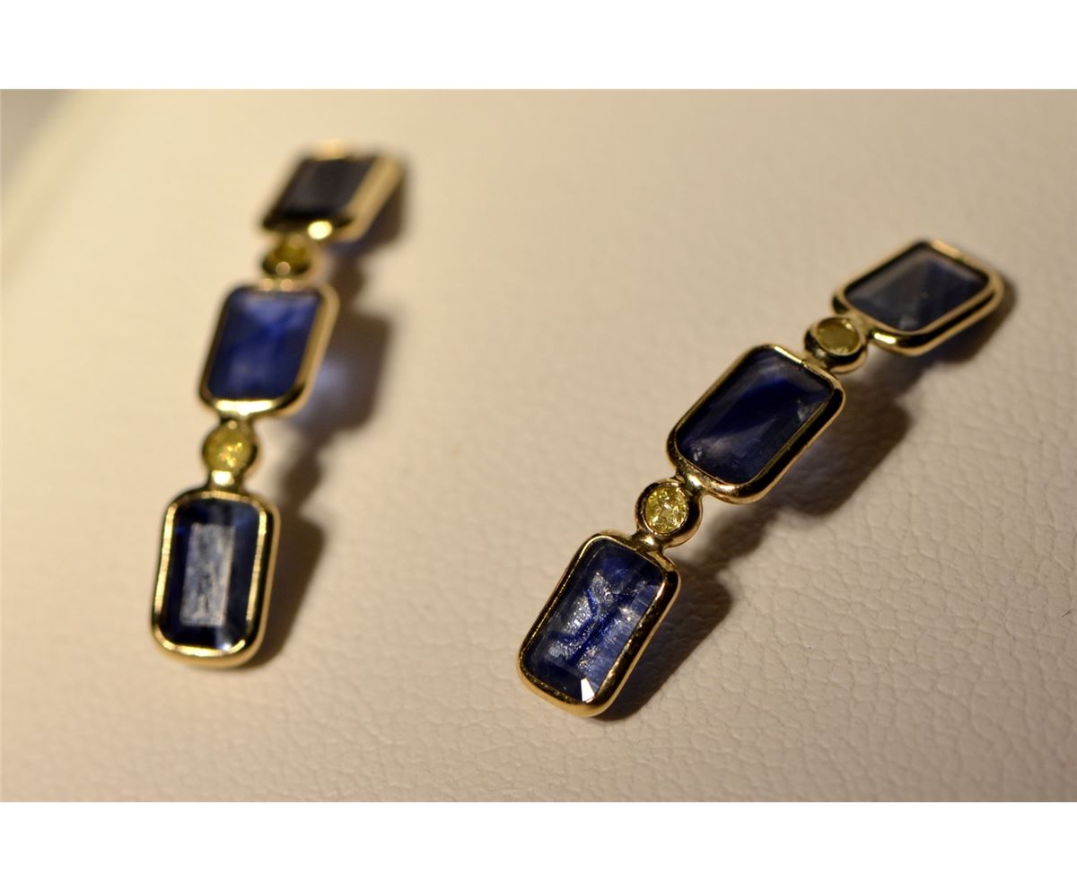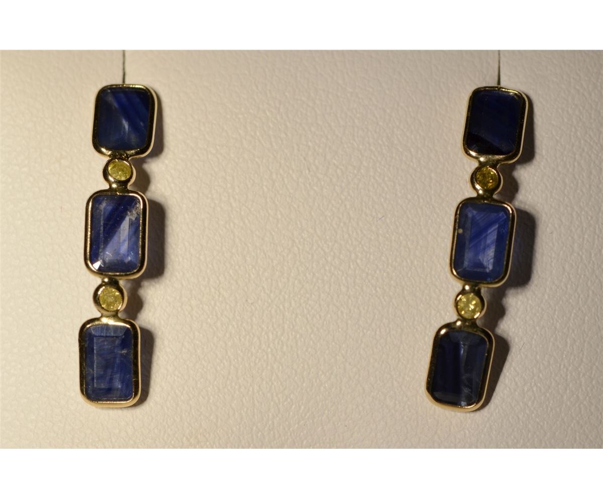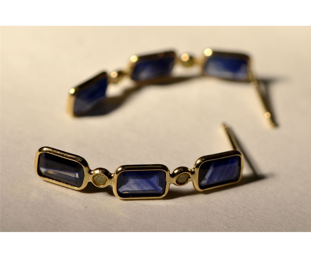 6 Rectangular Shaped Sapphires (3.50 cts), 4 Round Brilliant Cut Diamonds (0.15 cts), Half-Hoop Drop Style Earrings, with certificate