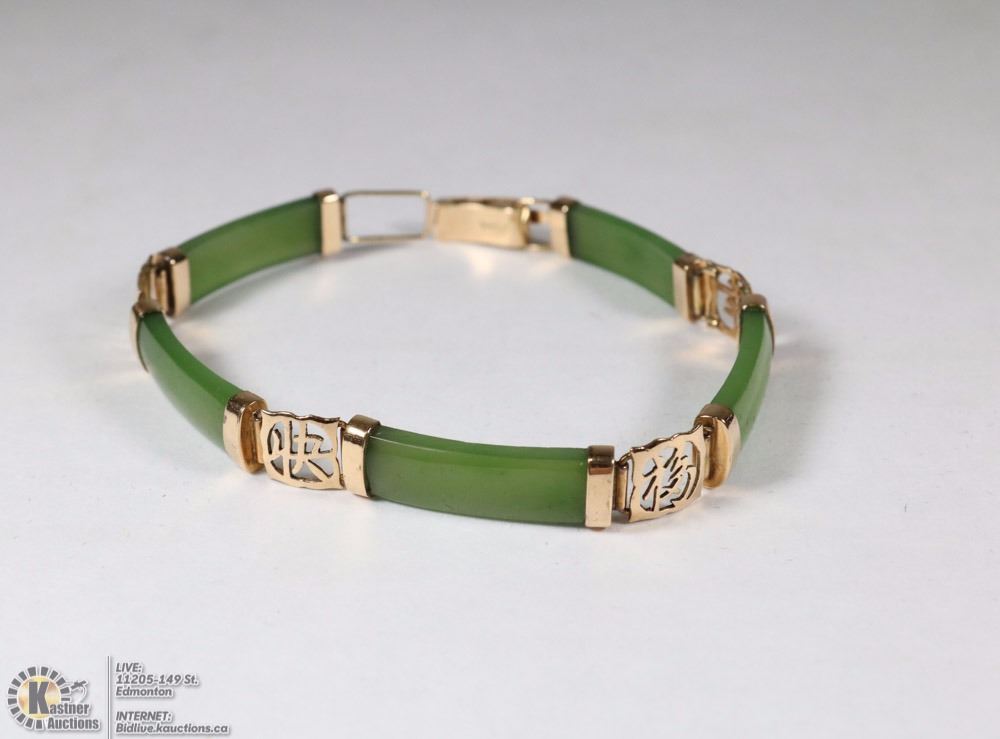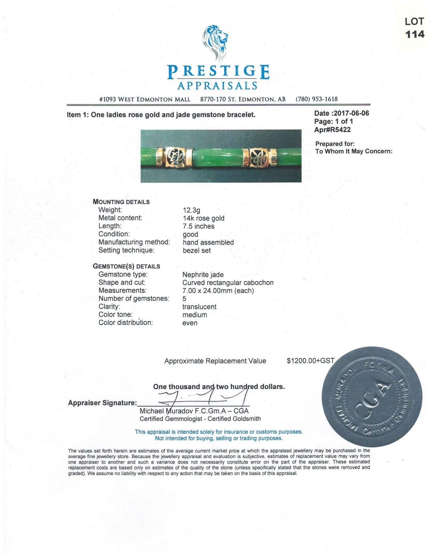 14K ROSE GOLD AND NEPHRITE JADE BRACELET W/COA