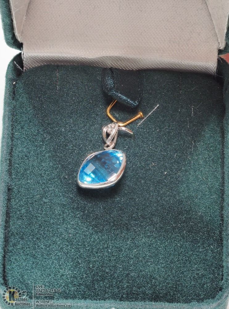 18-NT17: 14K WHITE GOLD BLUE TOPAZ PENDANT WITH DIAMOND HEART BAIL. W/ COA - SUGGESTED RETAIL VALUE $600.00
