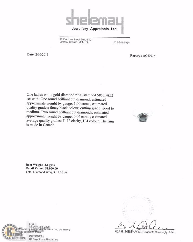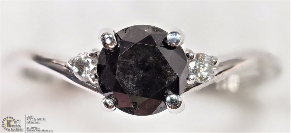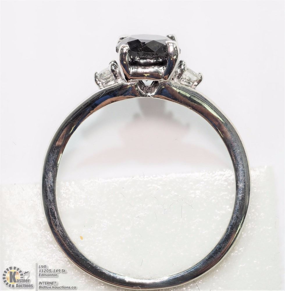 37-NT17: 14K WHITE GOLD BLACK DIAMOND (1.0CT) WITH 2 ACCOMPANYING WHITE DIAMONDS RING. W/ COA - SIZE 6. SUGGESTED RETAIL VALUE $1,900.00