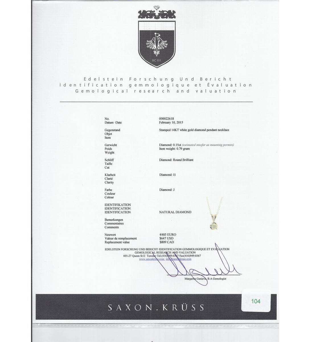 0.15 cts, Round Brilliant Cut, with 10K Gold Chain, with certificate