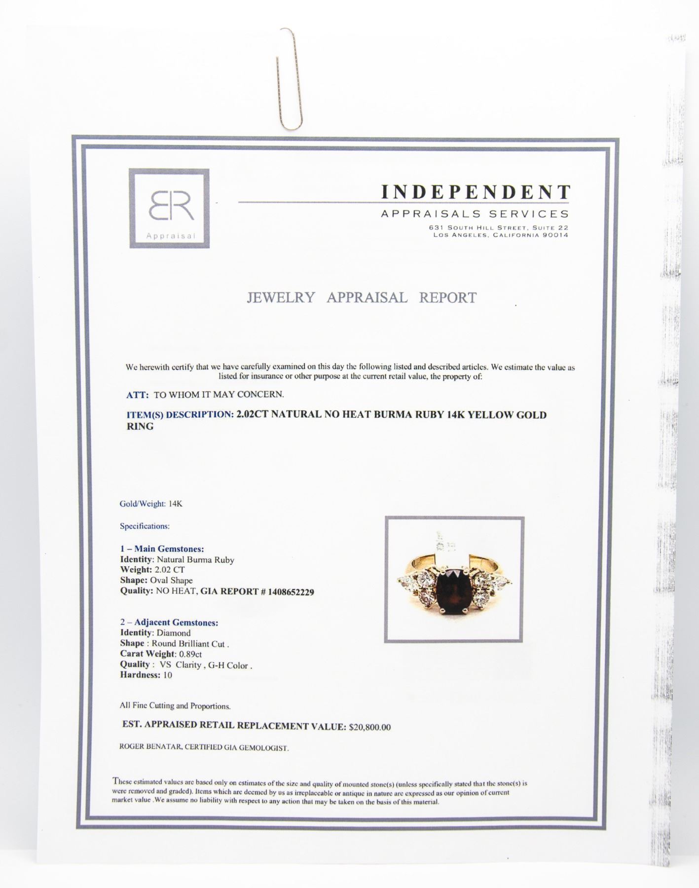 GIA#: 1408652229 SHAPE IS OVAL, CUTTING STYLE AT CROWN IS BRILLIANT, CUTTING STYLE AT PAVILLON IS STEP CUT, TRANSPARENCY IS TRANSPARENT, CENTER STONE IS A 2.02CT NATURAL NO HEAT RUBY. GROSS WEIGHT OF RING IS 5.32G. ESTIMATED REPLACEMENT VALUE IS $20,800.00 **ALL ITEMS MUST BE REMOVED BY 5PM SATURDAY, JANUARY 21ST 2023. ALL MAGIC SPACE ITEMS MUST BE REMOVED BY WEDNESDAY, JANUARY 18TH AND ARE LOCATED AT 9058-22 AVENUE SW #102. **ALL REMAINING ITEMS WILL BE SUBJECT TO A $6.00 PER DAY STORAGE CHARGE. ANY ITEMS REMAINING AFTER MONDAY, FEBRUARY 6TH, 2023 WILL BE CONSIDERED FORFEITED. NO REFUNDS WILL BE ISSUED FOR FORFEITED ITEMS. TO SCHEDULE A PICK UP APPOINTMENT CLICK HERE