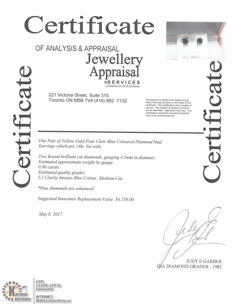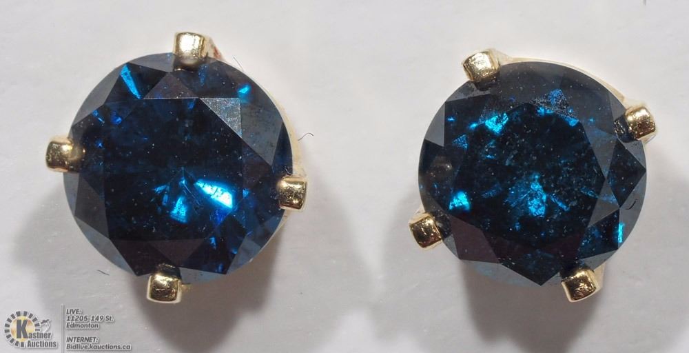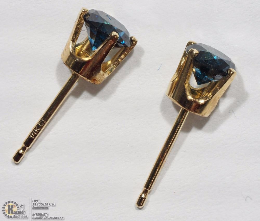 (47 - AC4: E1600) 14K YELLOW GOLD BLUE DIAMOND(0.96CT) STUD EARRINGS. W/ COA - SUGGESTED REPLACEMENT VALUE $4,150.00
