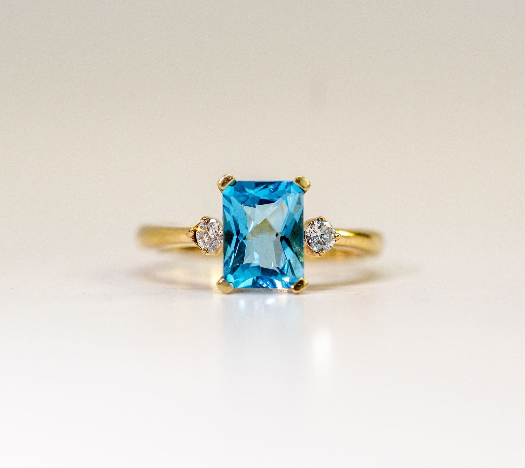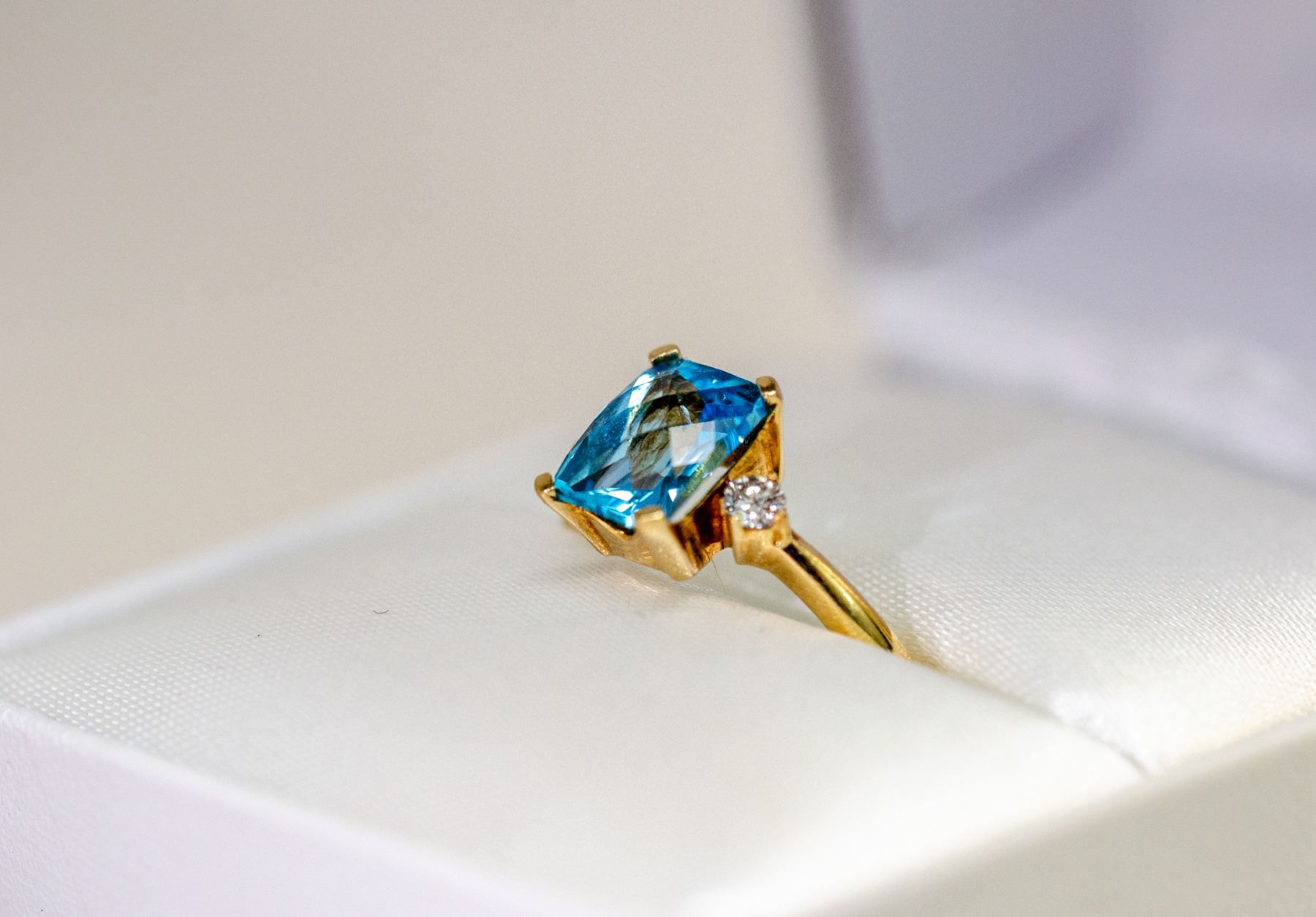 SIZE-5.25 A 14 KARAT YELLOW GOLD BLUE TOPAZ AND DIAMOND RING THE BRIGHT POLISHED MOUNT WITH DIAMOND SET SHOULDERS CENTER A FOUR PRONG SET, RECTANGULAR SHAPED, CHECKER FACETED NATURAL BLUETOPAZ MCASURING 8.08 - 6.10 X440 MM. TONE MEDIUM DARK, HUE SWISS BLUE. THE BLUC TOPAZ WEIGHS 2.00 CARATS THE SHOULDERS OF THE MOUNT ARE SCT WITH, TWO ROUND BRILLIANT CUT DIAMONDS MEASURING. 2.50 MM. CLARITY GRADE VS. COLOUR GRADE L TOTAL DIAMOND WEIGHT 0.12 CARAT. TOTAL WEIGHT 3.00 GRAMS. CERTIFICATE OF APPRAISAL FROM LOCAL APPRAISER,SUGGESTED INSURANCE COVERAGE $1400.00.