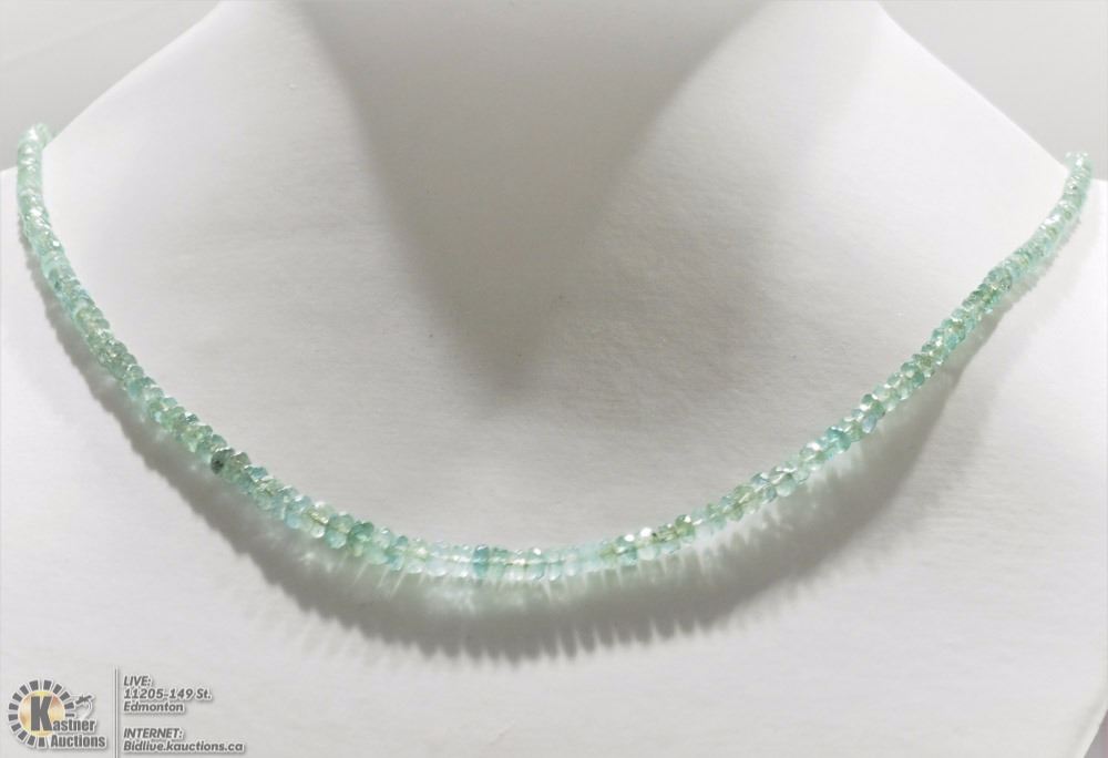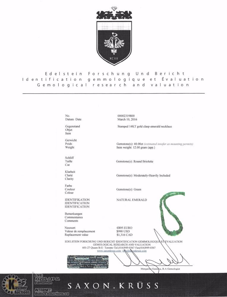 4-NT17: 14K YELLOW GOLD CLASP EMERALD (40.0CT) NECKLACE. W/ COA - SUGGESTED REPLACEMENT VALUE $1,316.00