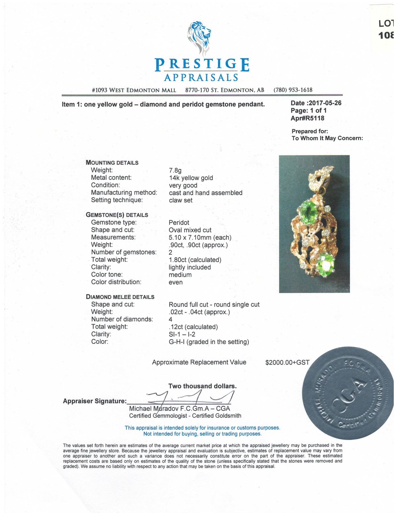 FROM LOCAL APPRAISER. SUGGESTED REPLACEMENT VALUE $2000.00. 1.80TCW