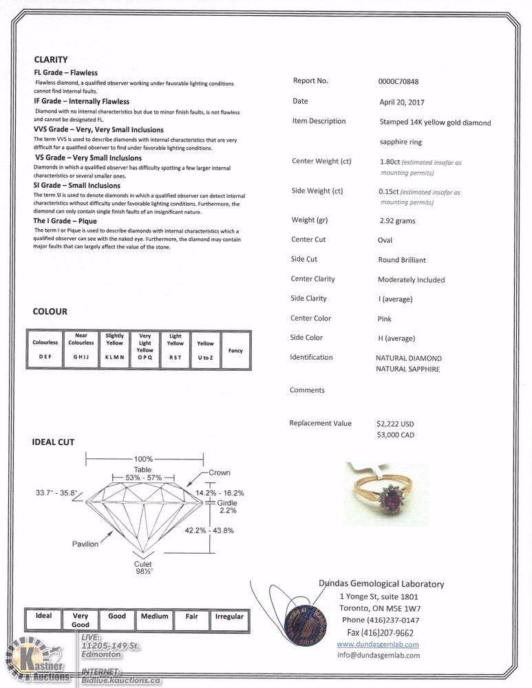 ITEM#32 - AC3: 14K YELLOW GOLD PINK SAPPHIRE(1.80CT) & DIAMOND(0.15CT) RING SIZE:9 W/ COA - SUGGESTED REPLACEMENT VALUE $3,000.00