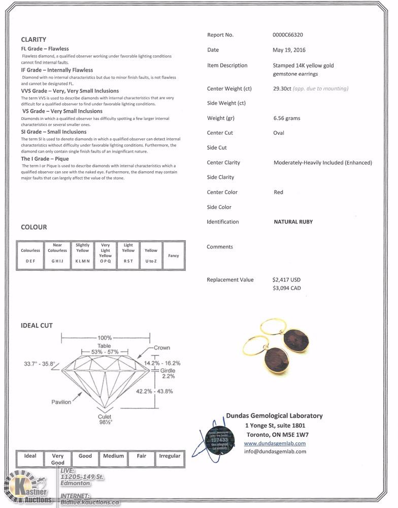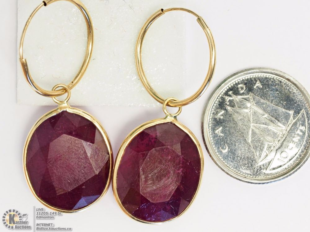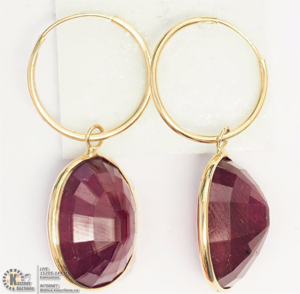 ITEM#37 - AC3: 14K YELLOW GOLD RUBY(29.30CT) HOOP EARRINGS. W/ COA - SUGGESTED REPLACEMENT VALUE $3,094.00