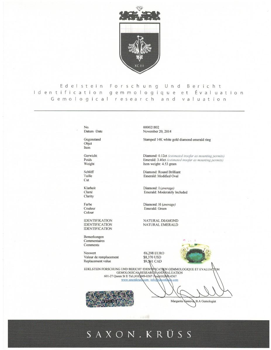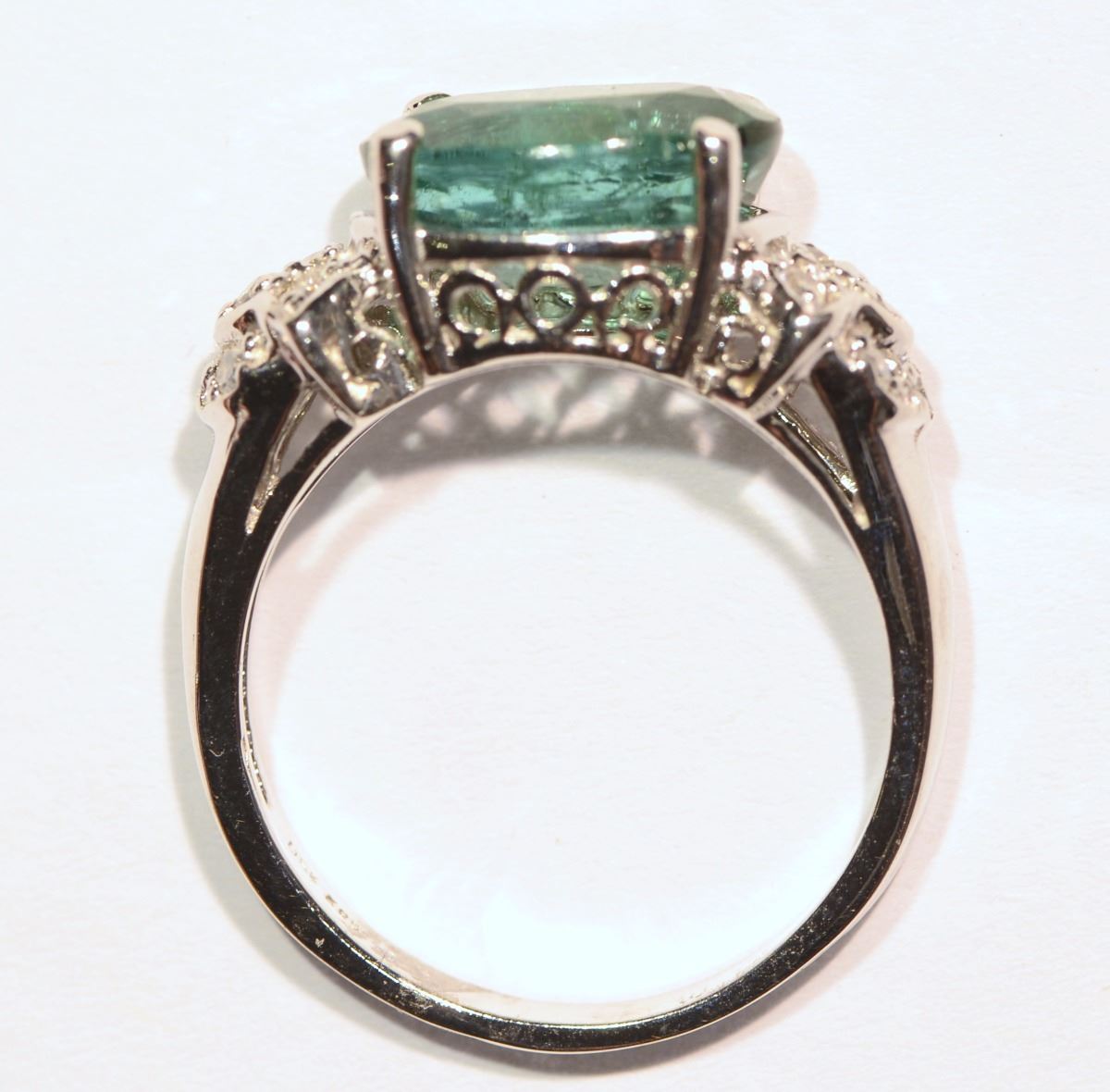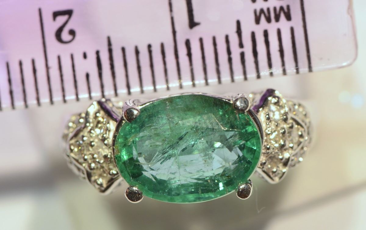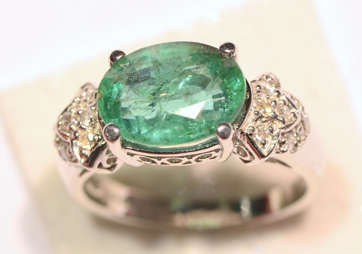 WHITE GOLD RING SET WITH 1 LARGE EMERALD (3.40CT) AND 12 SURROUNDING DIAMONDS