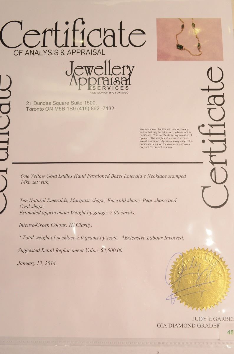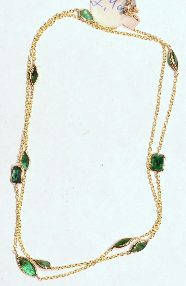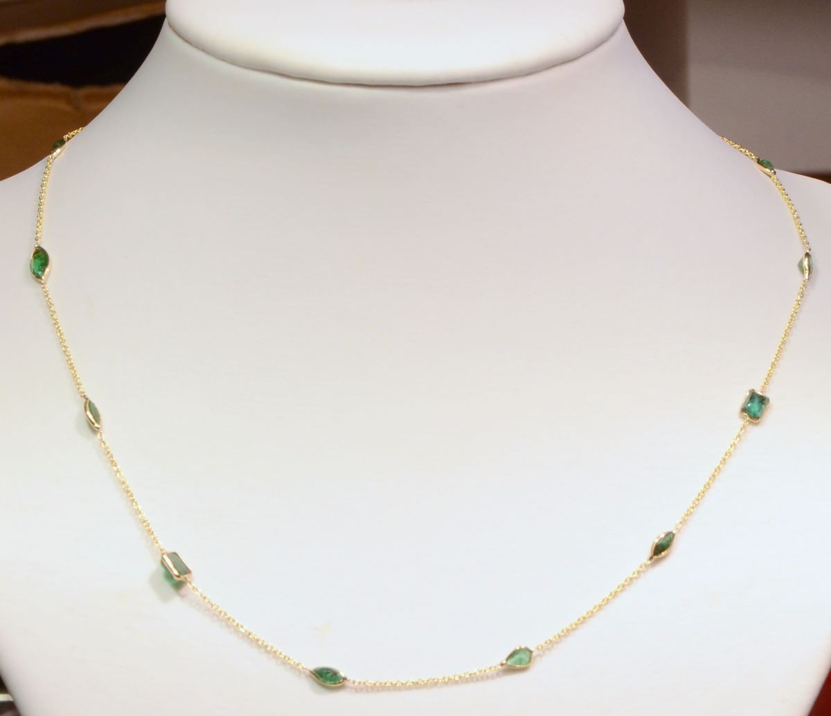 YELLOW GOLD NECKLACE WITH 10 EMERALDS (2.9CT) OF VARIOUS SHAPES BEZEL SET ON A THIN CHAIN - SUGGESTED REPLACEMENT VALUE $4,500.00