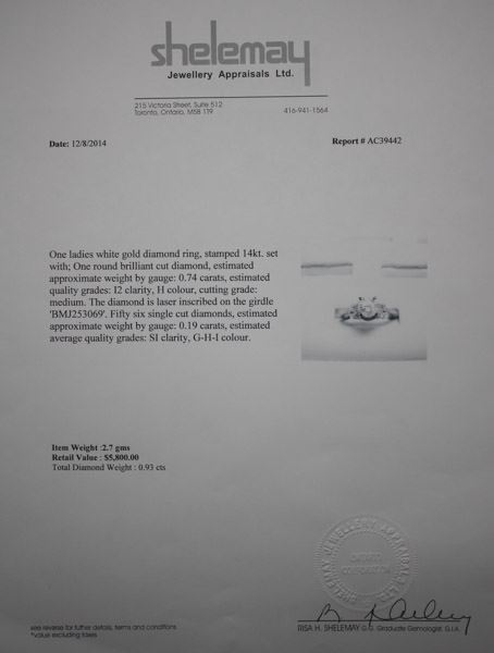 DIAMOND(0.74ct. & 0.19ct.), REPLACEMENT VALUE $5,800.00