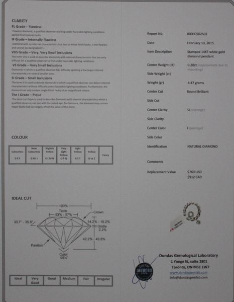 DIAMOND:0.20 CARAT, REPLACEMENT VALUE $912.00