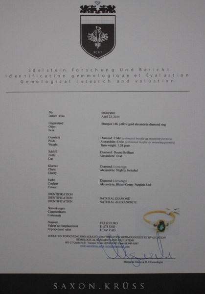 DIAMOND:0.04 CARATS, ALEXANDRITE: 0.40 CARATS, REPLACEMENT VALUE $ 1,745.00