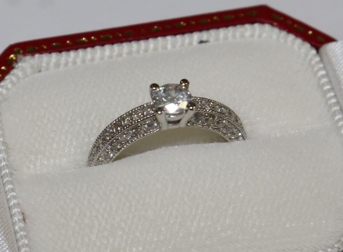White gold ring set with 1 beautiful diamond (0.60ct) surrounded by 18 diamond son each side of the ring