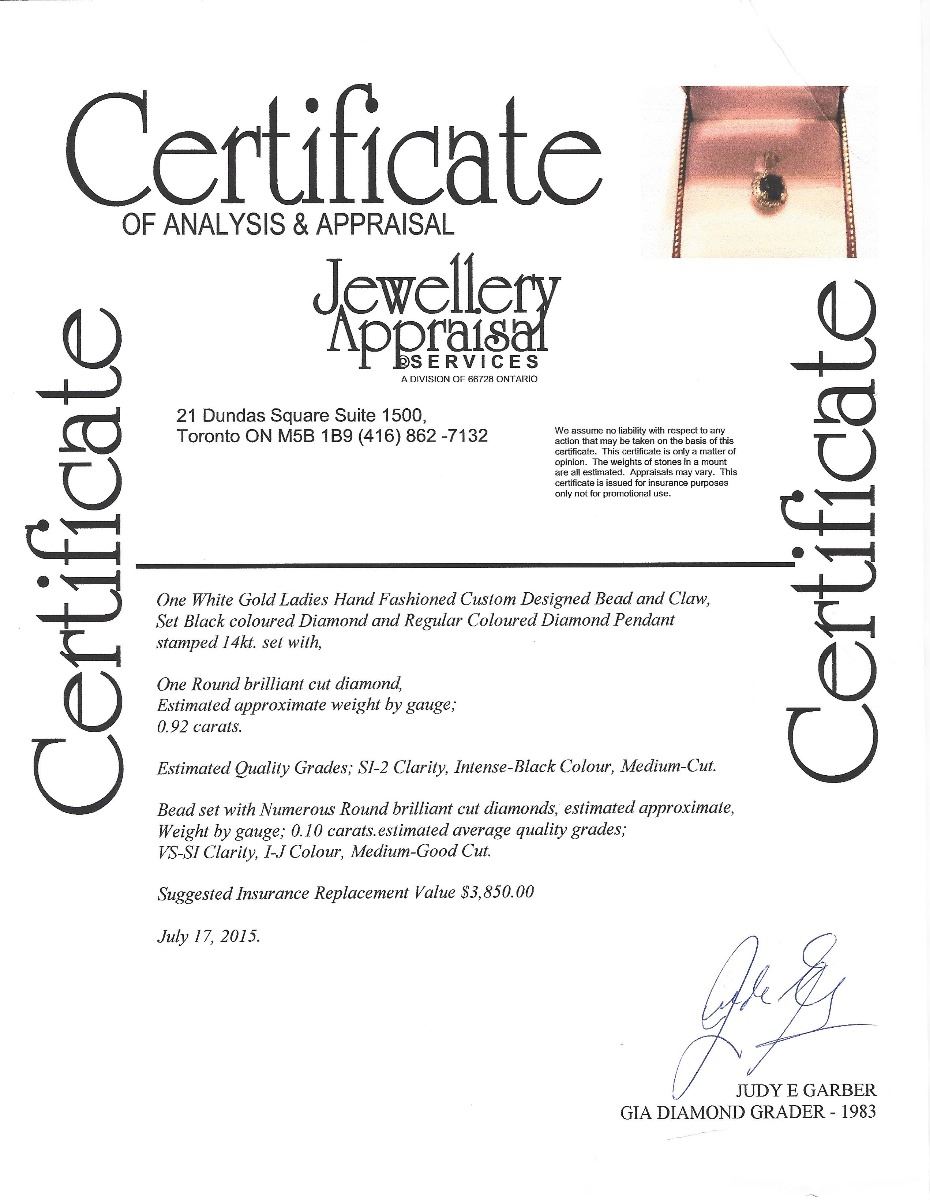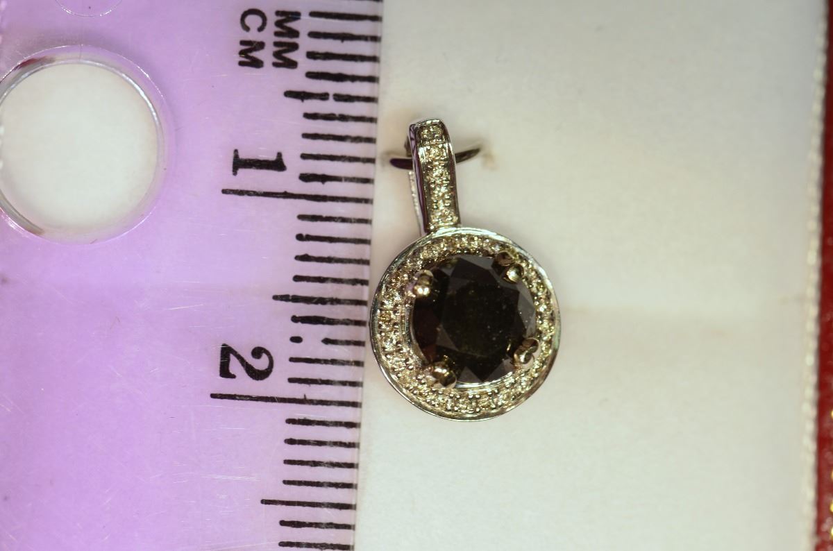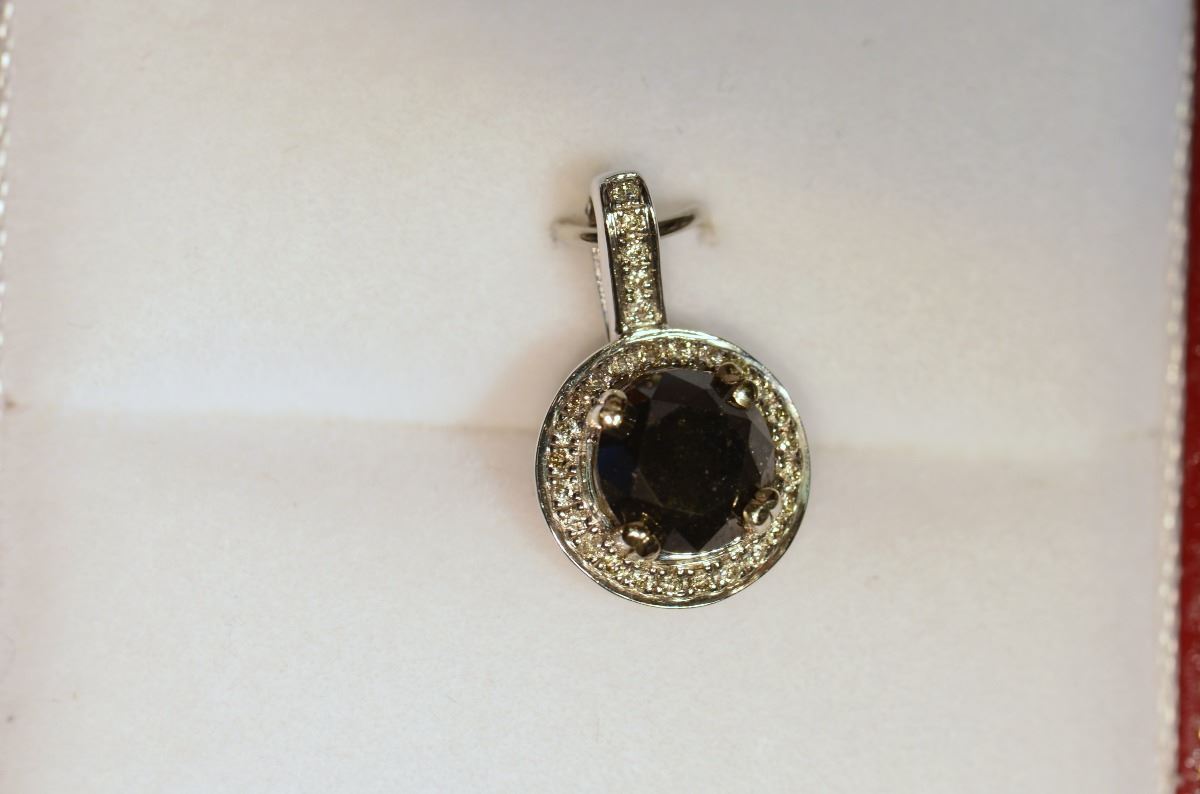 MSRP $3,850.00 - Pendant addorned with 1 Black Diamond at 0.92ct surrounded by numerous White Diamonds at 0.10ct total