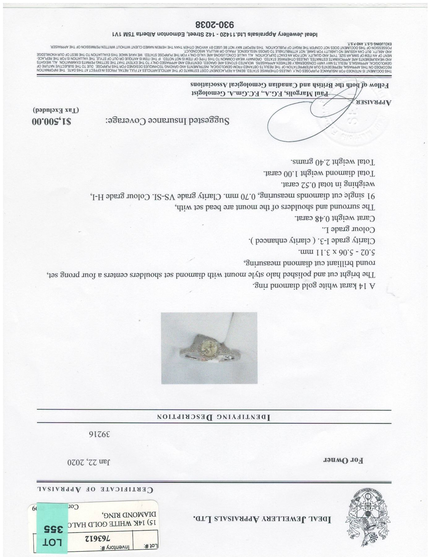 SIZE 7, ONE ROUND BRILLIANT CUT DIAMOND (MEASURING 5.02 - 5.06 X 3.11MM, CLARITY GRADE I-3 [CLARITY ENHANCED], COLOR GRADE L, CARAT WEIGHT 0.48 CARATS), 91 SINGLE CUT DIAMONDS (MEASURING 0.70MM, CLARITY GRADE VS-SI, COLOR GRADE H-I, WEIGHS 0.52 CARATS), TOTAL DIAMOND WEIGHT 1.00 CARATS. COMES WITH CERTIFICATE OF APPRAISAL FROM LOCAL APPRAISER, SUGGESTED INSURANCE COVERAGE $1,500.00. JEWELLERY