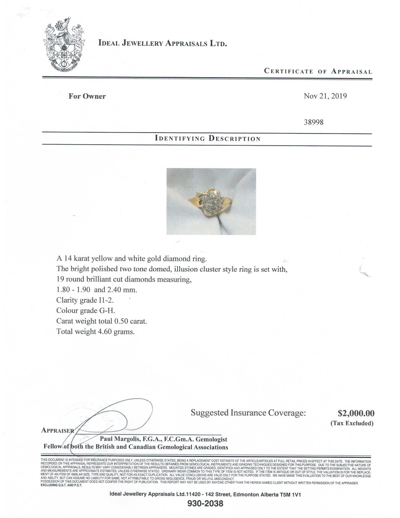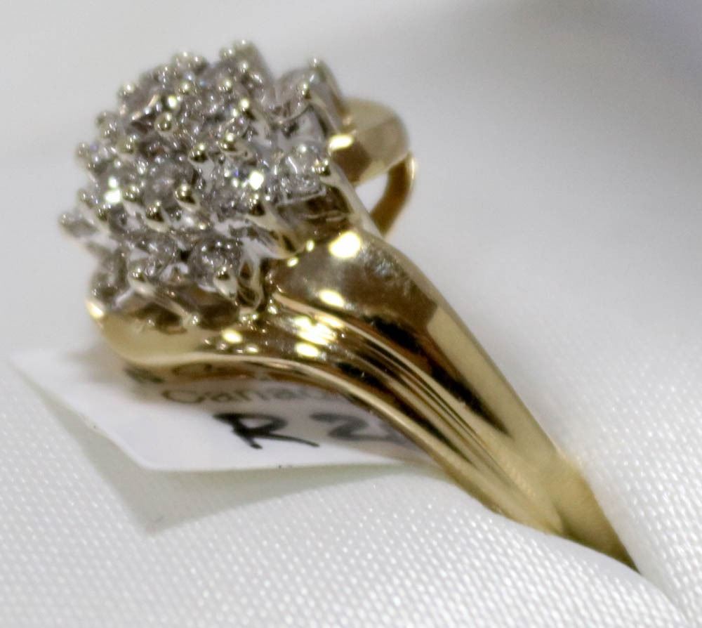 SIZE 6.25 WITH LOCAL APPRAISAL, 19 ROUND BRILLIANT CUT DIAMONDS, CLARITY GRADE I1-2, COLOR GRADE G-H, CARAT WEIGHT 0.50 CARATS, TOTAL WEIGHT 4.60 GRAMS, SUGGESTED INSURANCE COVERAGE $2,000.00. JEWELLERY