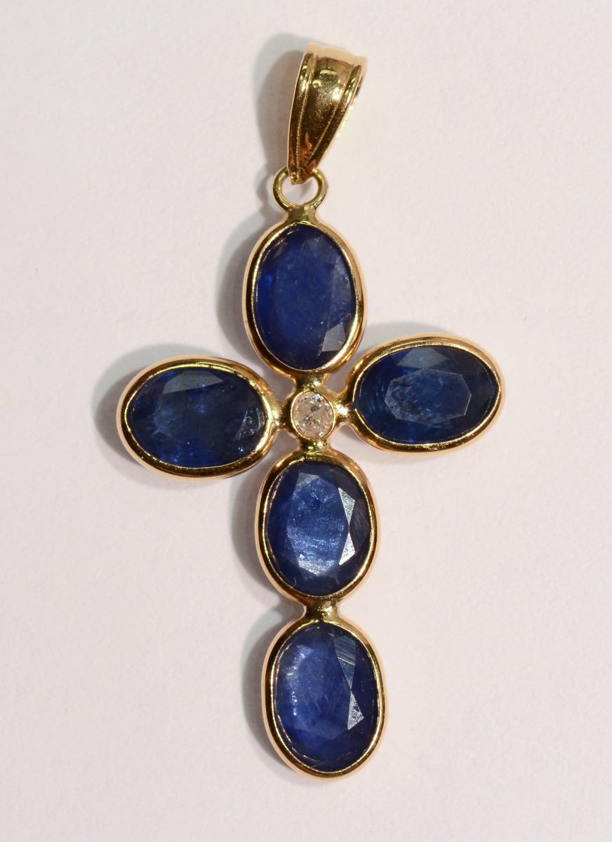 YELLOW GOLD PENDANT WITH 5 SAPPHIRES (2.85CT) IN CROSS PATTERN WITH DIAMOND IN THE CENTER