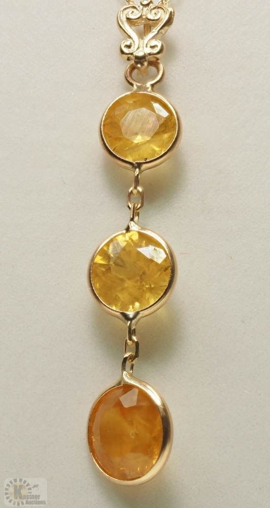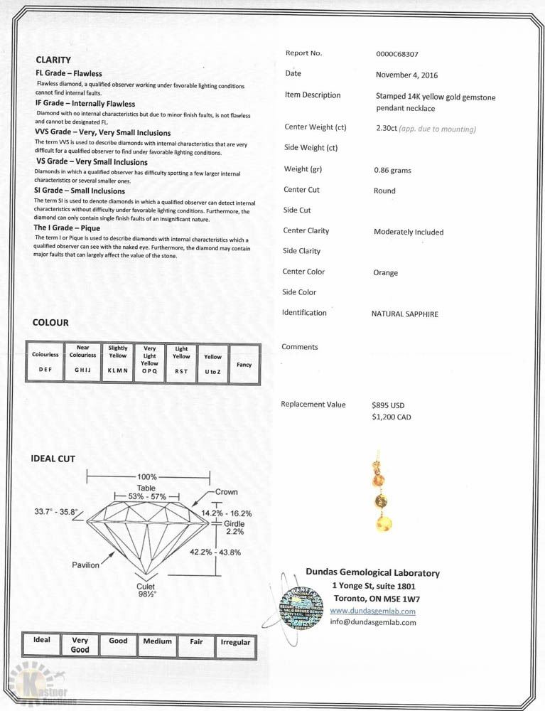 14KT YELLOW GOLD ORANGE SAPPHIRE (2.30CT) PENDANT NECKLACE W/ COA - SUGGESTED REPLACEMENT VALUE $1,200.00